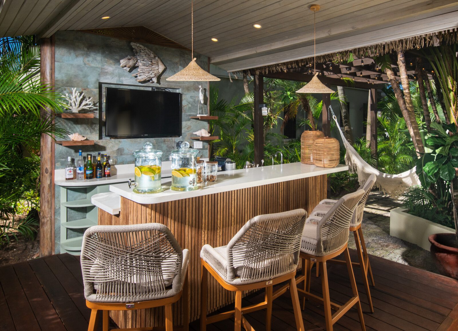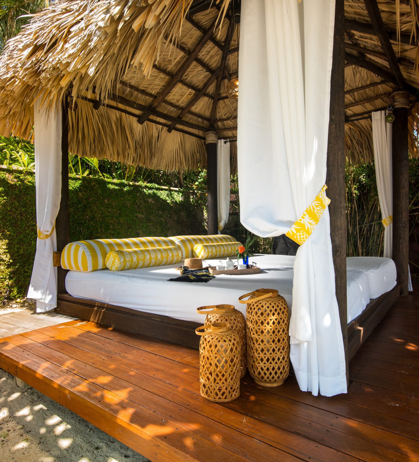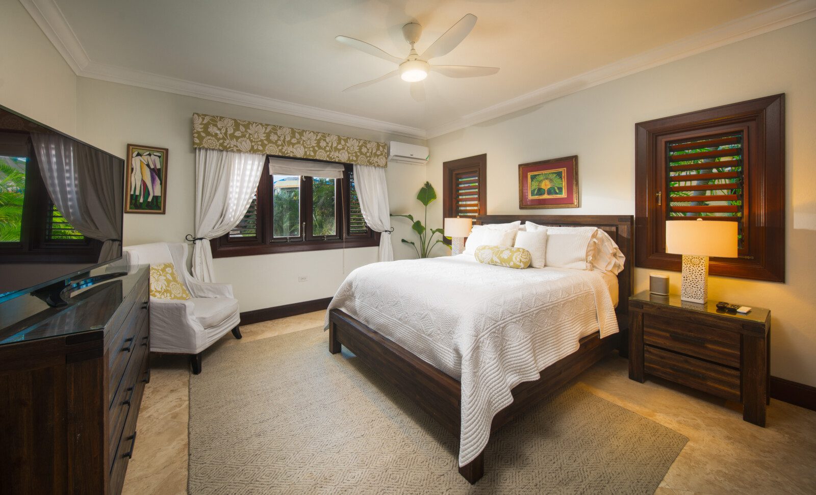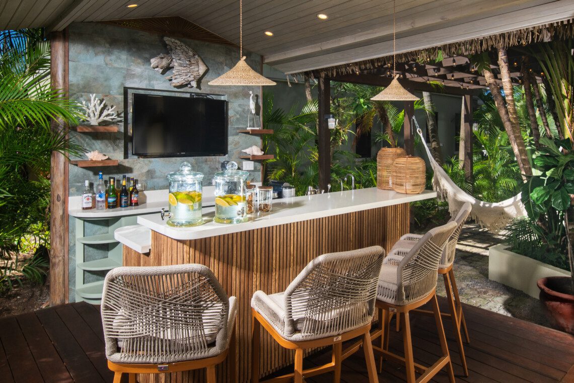 The family room is air-conditioned with a 47’ flat screen television and BOSE surround sound. The restaurant-quality kitchen provides extraordinary meals. The villa comes with a full-time cook, a personal butler, a gardener and a housekeeper, making the holiday a truly memorable one. The private beach cabana provides a relaxing experience, as does the newly opened outdoor tiki bar next to the pool.