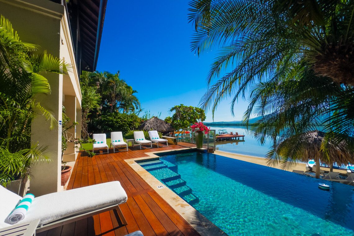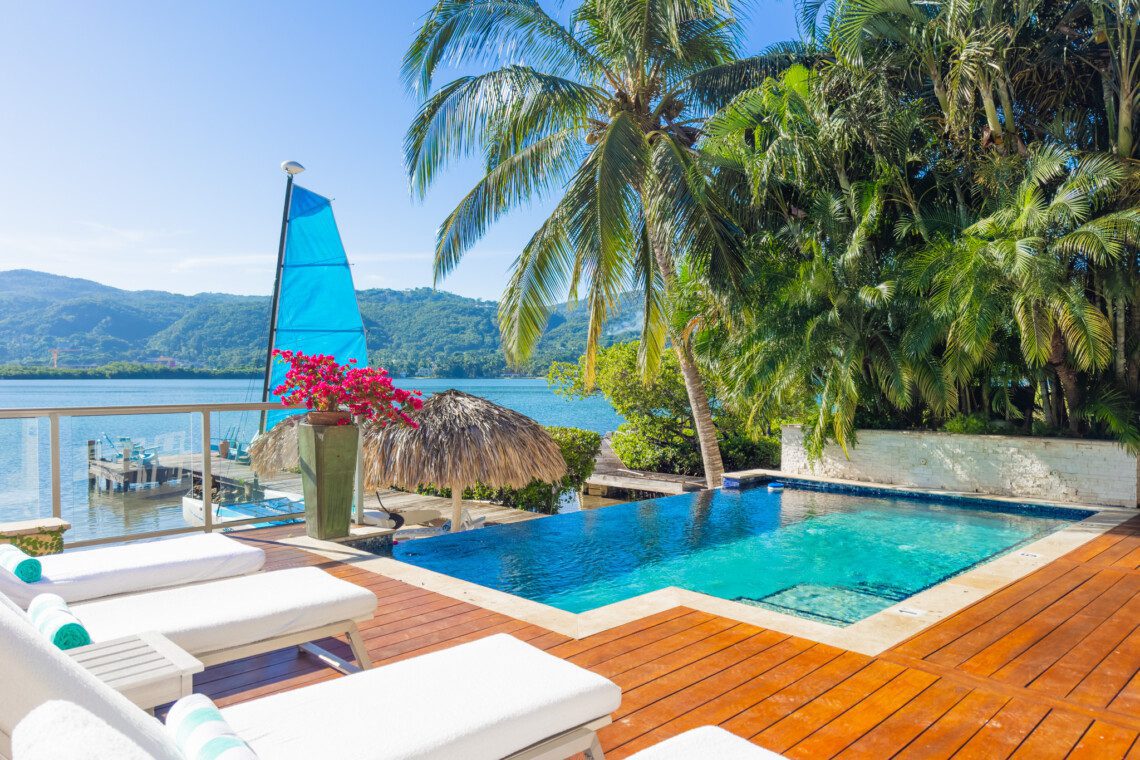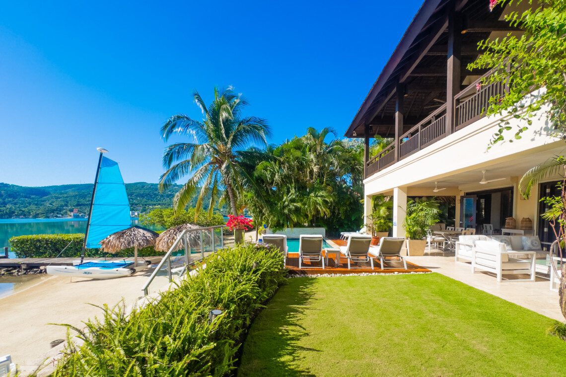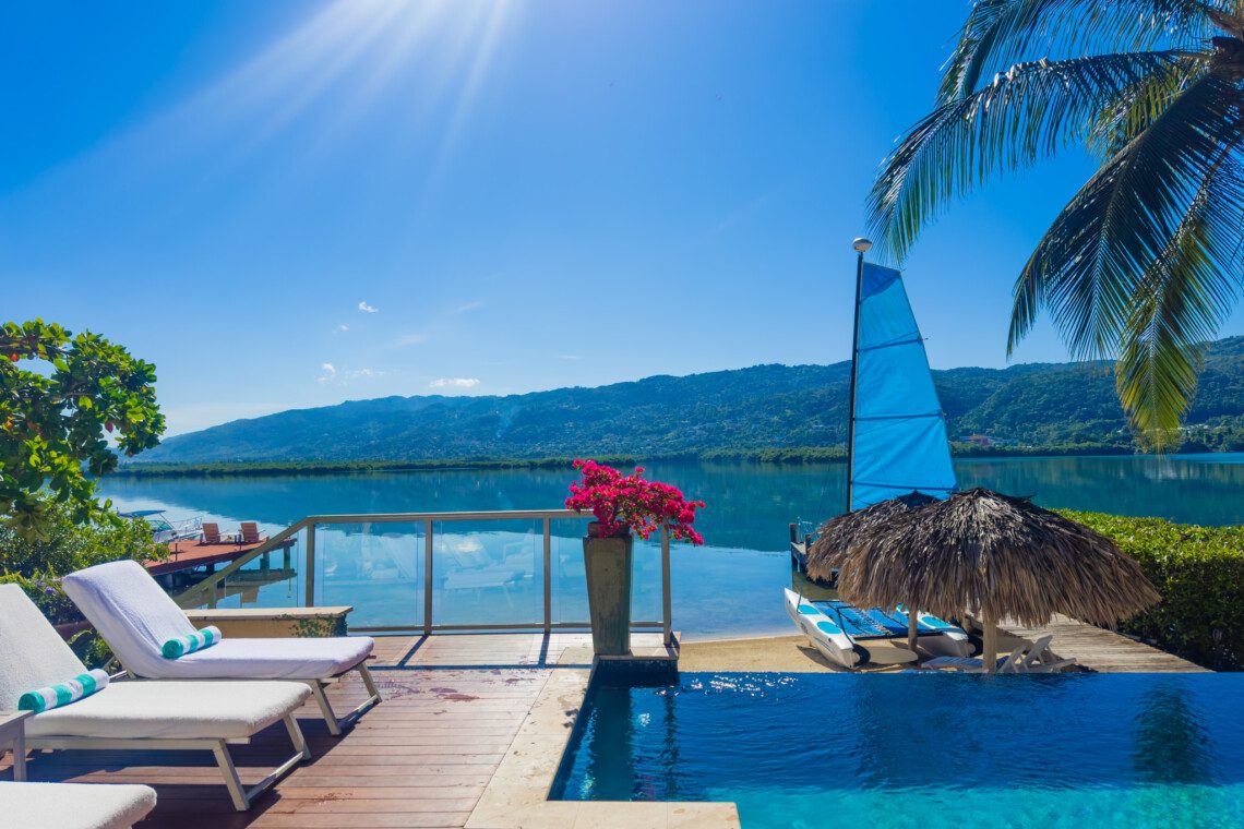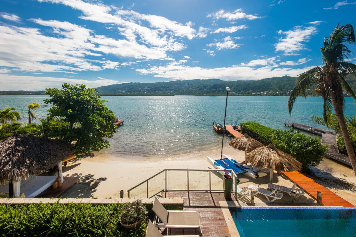Located on a private white sand beach in Jamaica, A Beach Villa is one of the most stunning beachfront luxury villas with an infinity edge pool and spectacular view. A Beach Villa is located in the fabulous Lagoons, a community in Montego Bay that is just a 10-minute drive from the airport. The Lagoons is an exclusive community with 24 hour security, a large gym, a main pool and 2 tennis courts with a tennis pro. On either side of the Lagoons, which sit on a narrow peninsula, is the ocean.