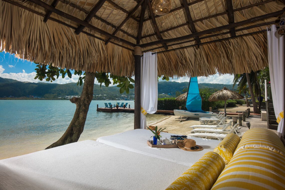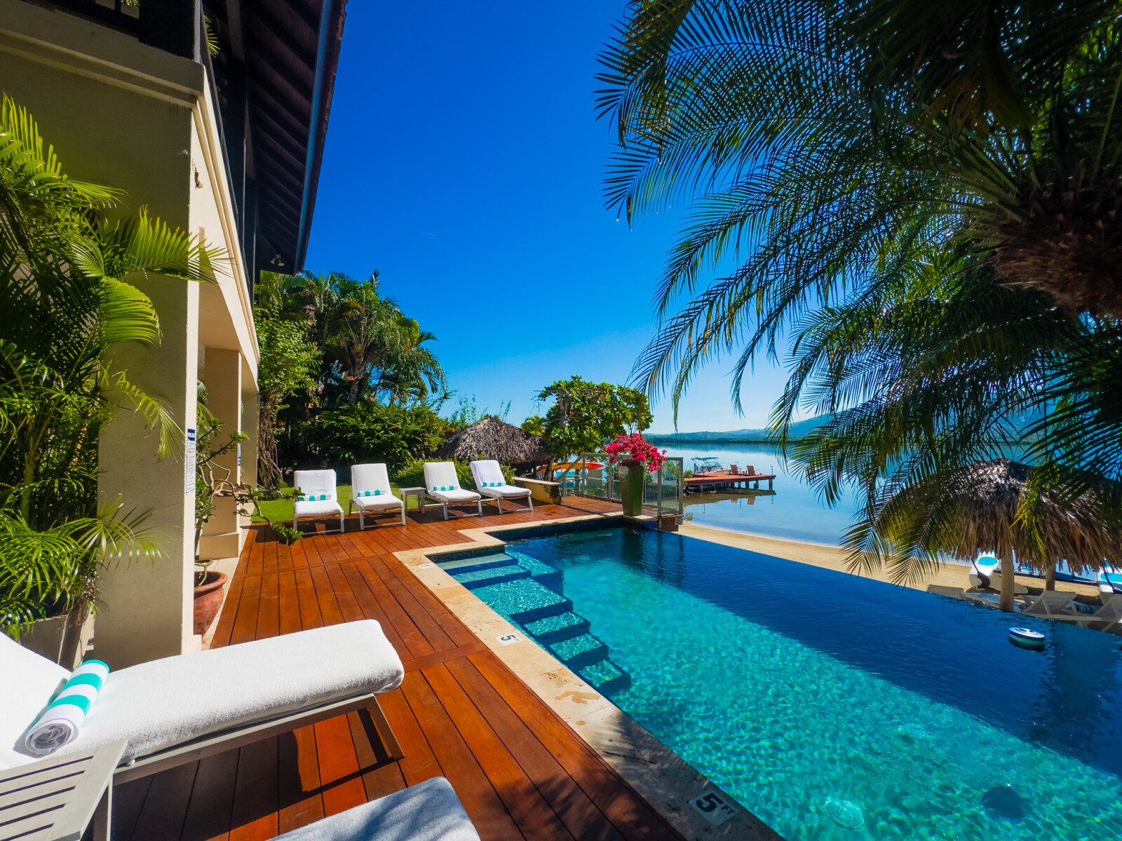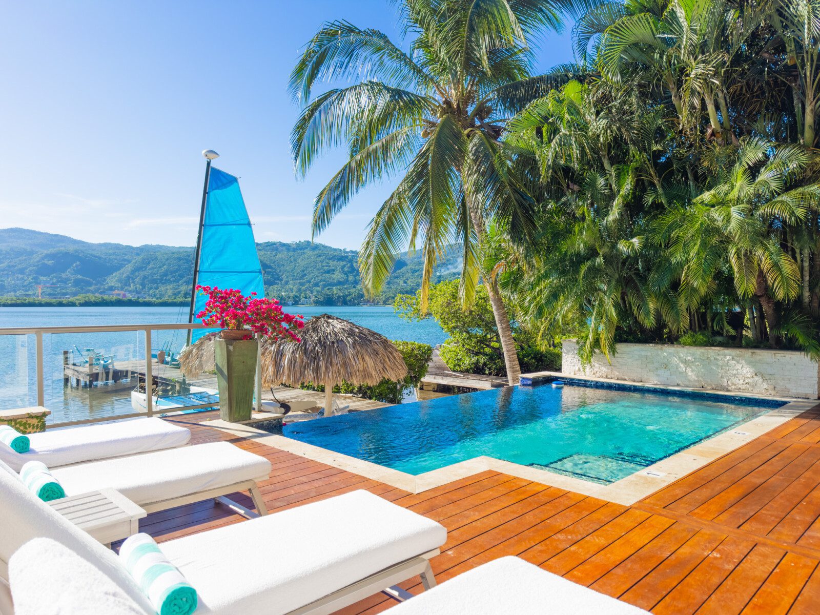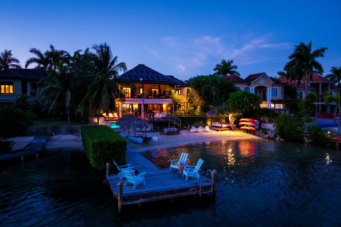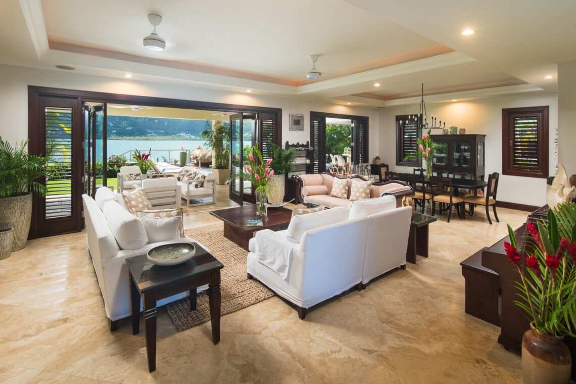 Located on a private white sand beach in Jamaica, A Beach Villa is one of the most stunning beachfront luxury villas with an infinity edge pool and spectacular view. A Beach Villa is located in the fabulous Lagoons, a community in Montego Bay that is just a 10-minute drive from the airport. The Lagoons is an exclusive community with 24 hour security, a large gym, a main pool and 2 tennis courts with a tennis pro. On either side of the Lagoons, which sit on a narrow peninsula, is the ocean.