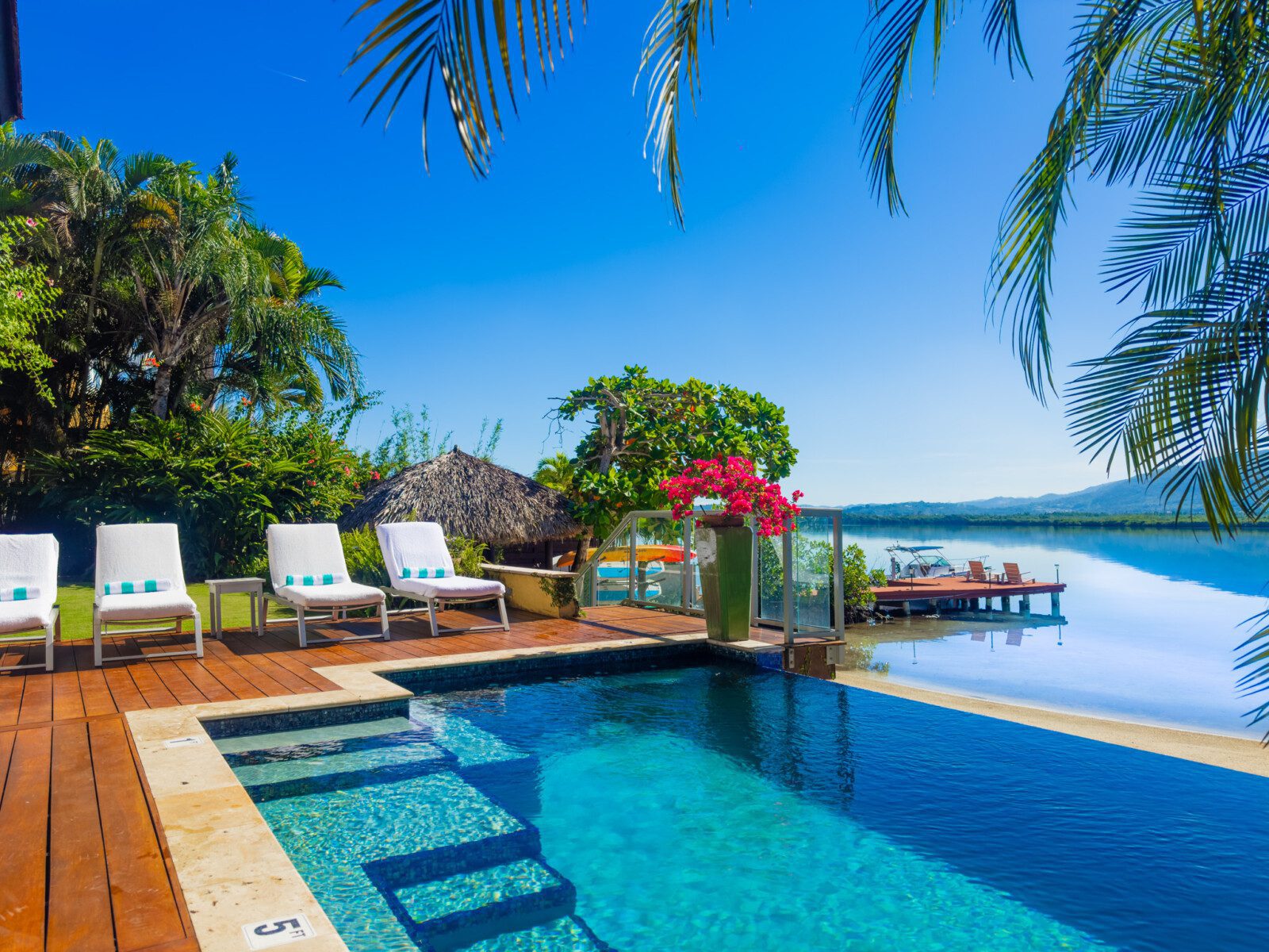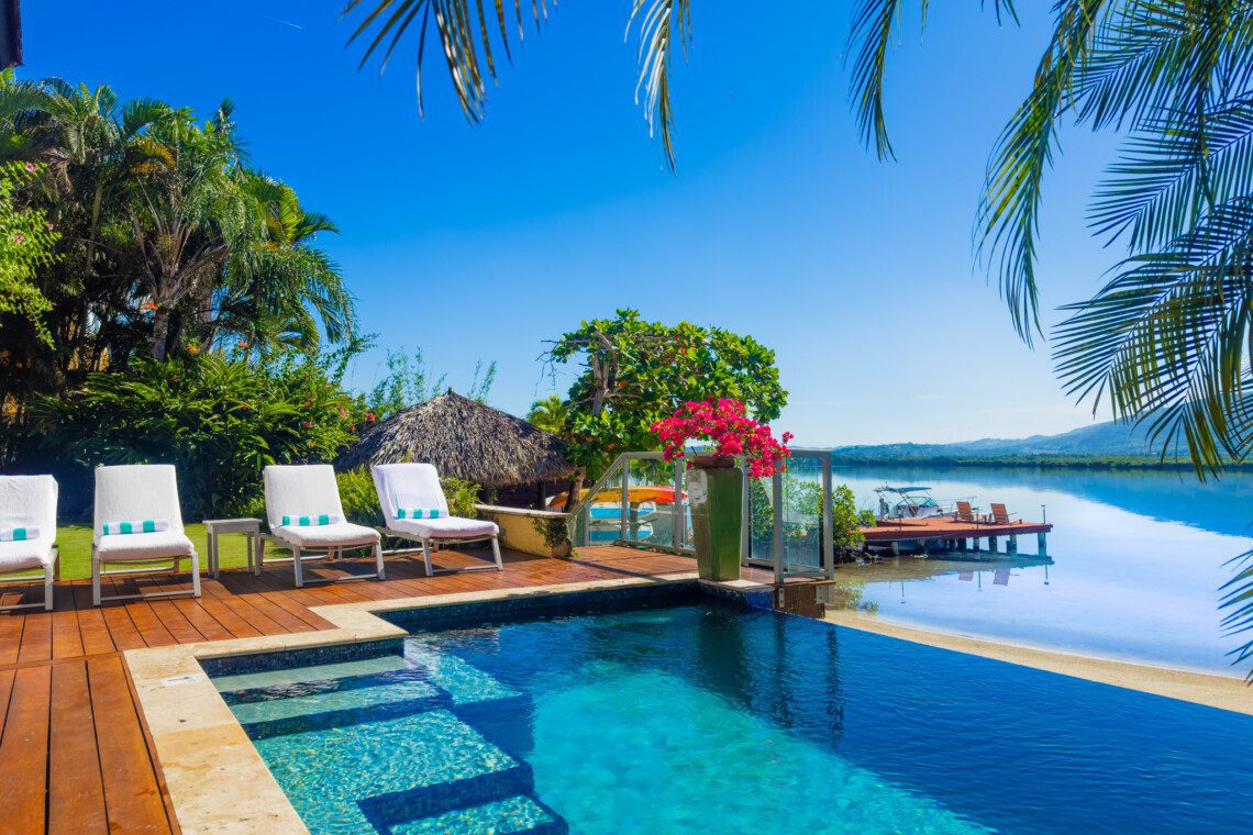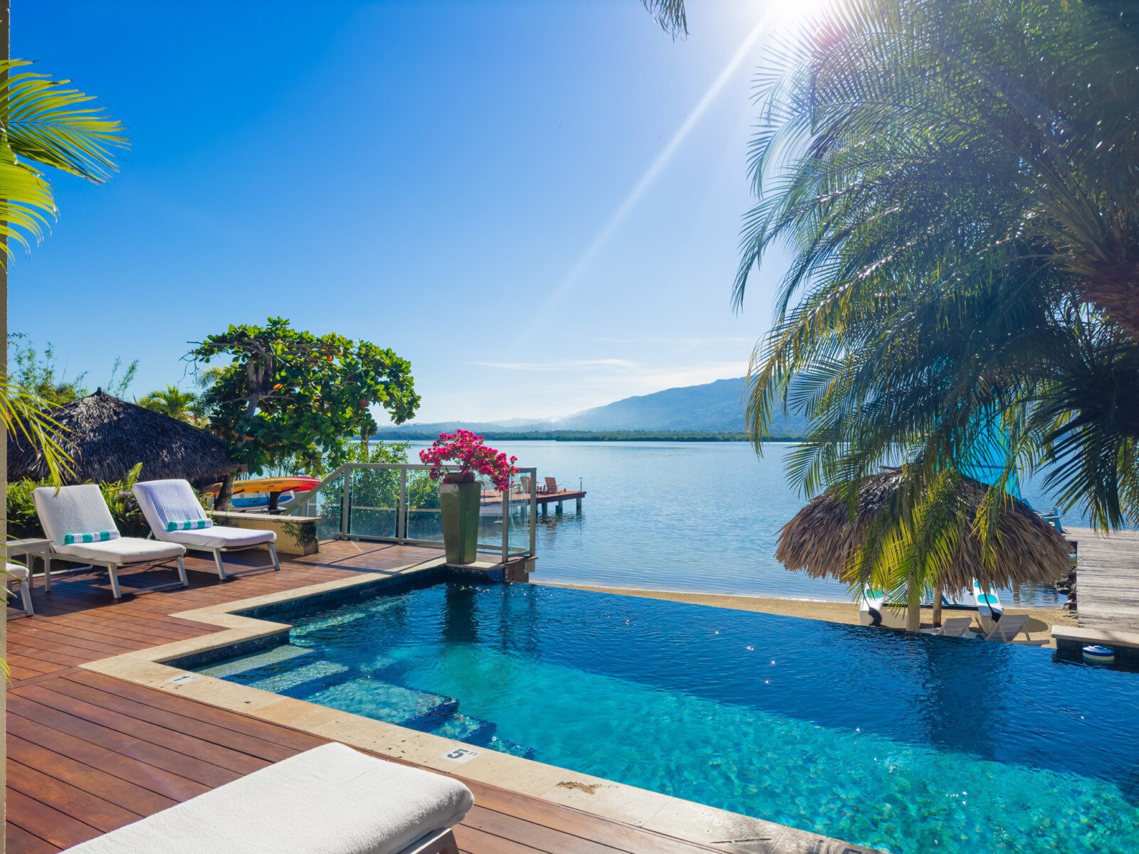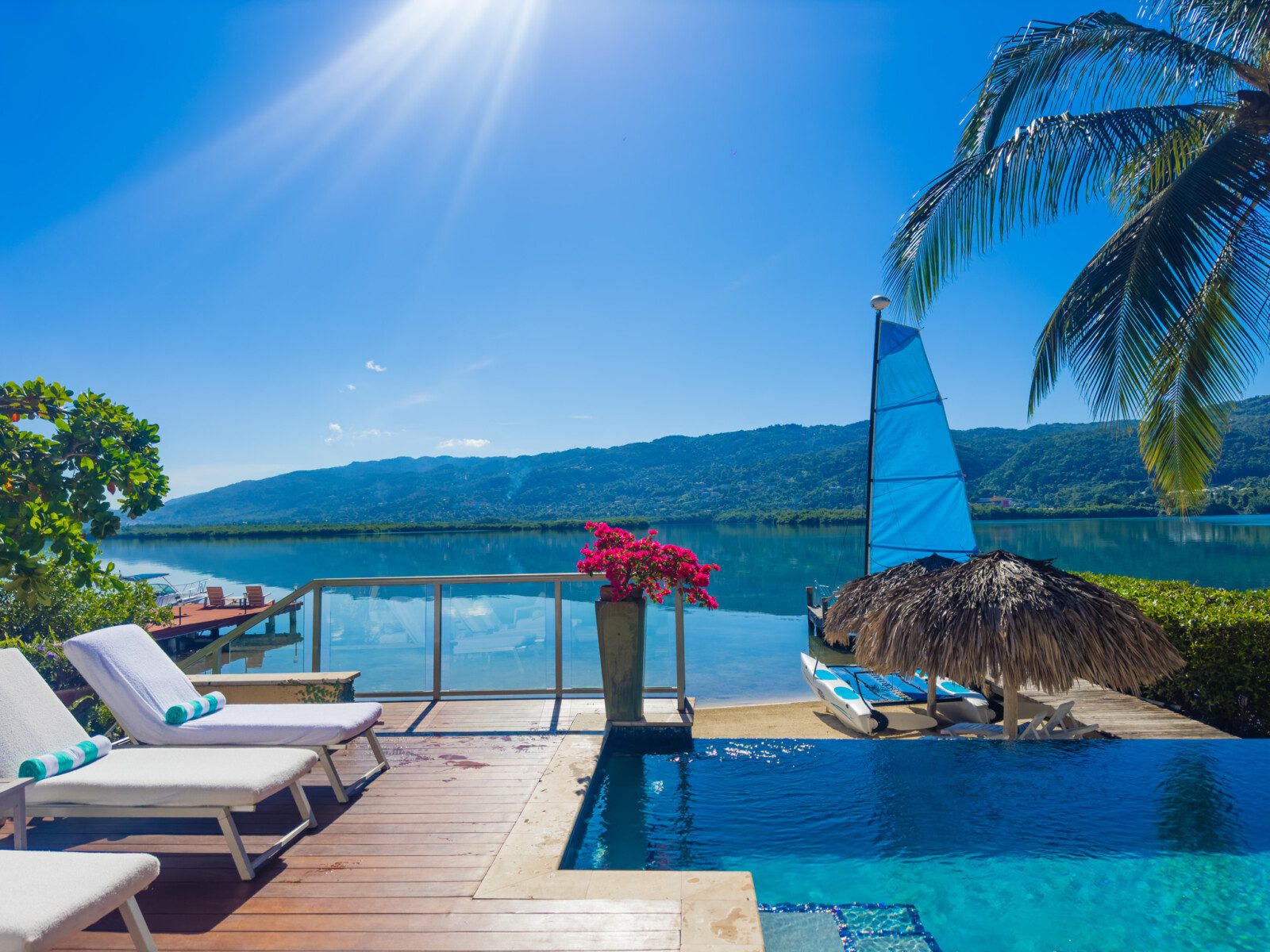 Located on a private white sand beach in Jamaica, A Beach Villa is one of the most stunning beachfront luxury villas with an infinity edge pool and spectacular view. A Beach Villa is located in the fabulous Lagoons, a community in Montego Bay that is just a 10-minute drive from the airport. The Lagoons is an exclusive community with 24 hour security, a large gym, a main pool and 2 tennis courts with a tennis pro. On either side of the Lagoons, which sit on a narrow peninsula, is the ocean.