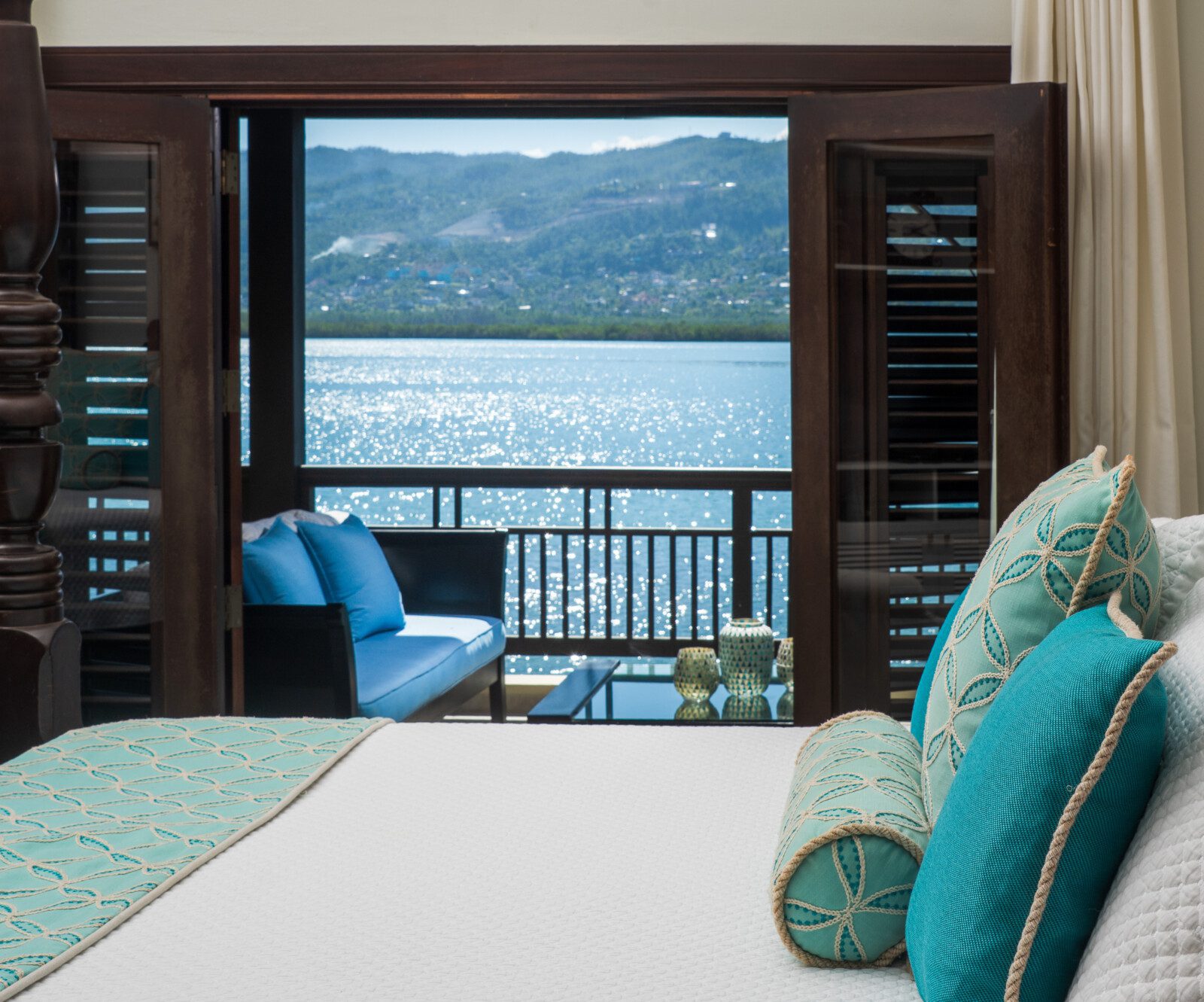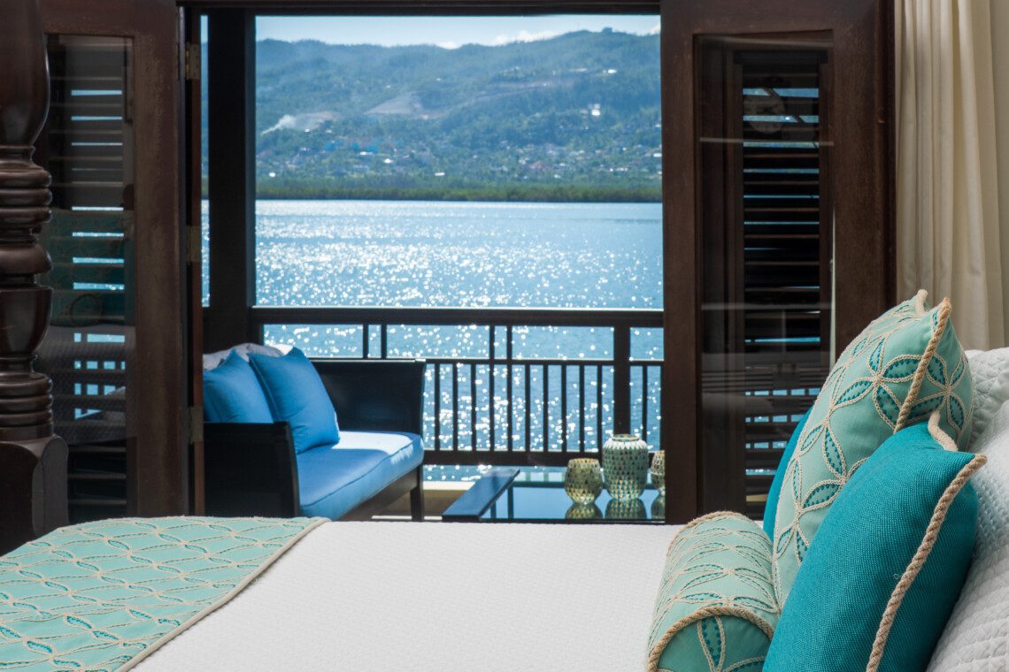 King-size bed, 32″ television, large en-suite bathroom with glass-door walk-in shower and deep-soaking tub. Suite opens to a private balcony overlooking the lagoon.