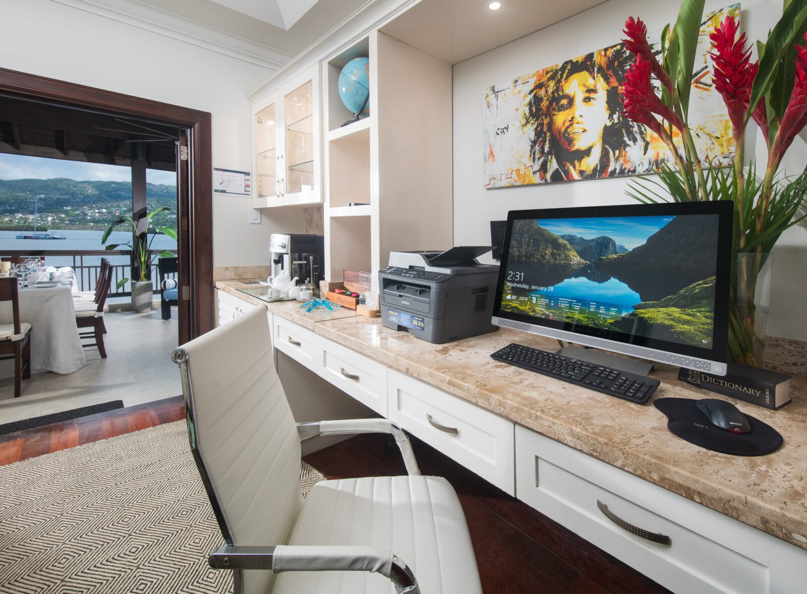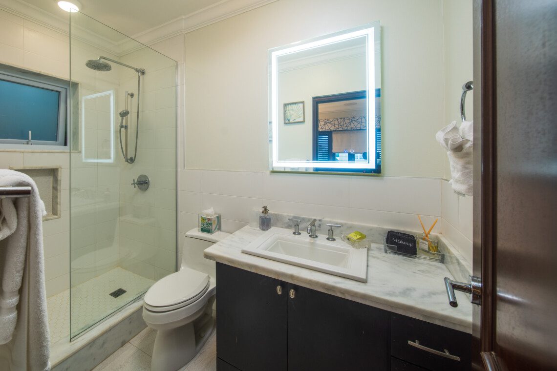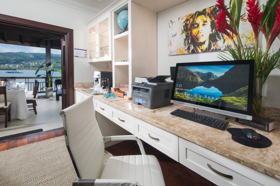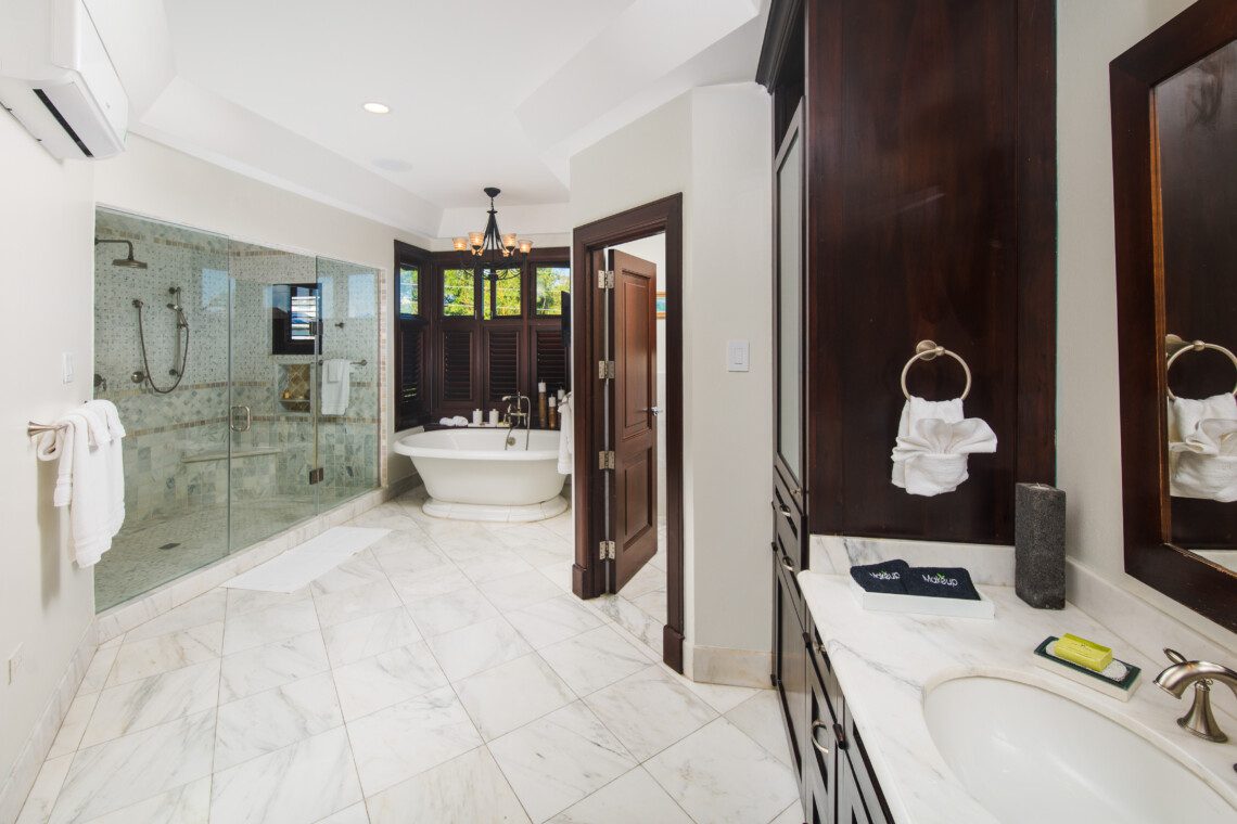 All bathrooms which are finished in natural stone, marble or granite have walk-in showers. Relax in the large master suite complete with a luxurious marble tiled bathroom with 8ft wide shower enclosure and spa-like soaking tub while watching your favorite movie on a wall mounted flat screen television. This suite opens onto a spacious upstairs patio where one can enjoy the breathtaking sunrise in the morning or have afternoon tea and wind-down to the view of the Montego Bay marine park’s lagoon with city lights as a backdrop.