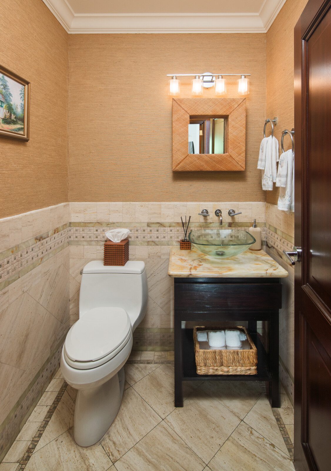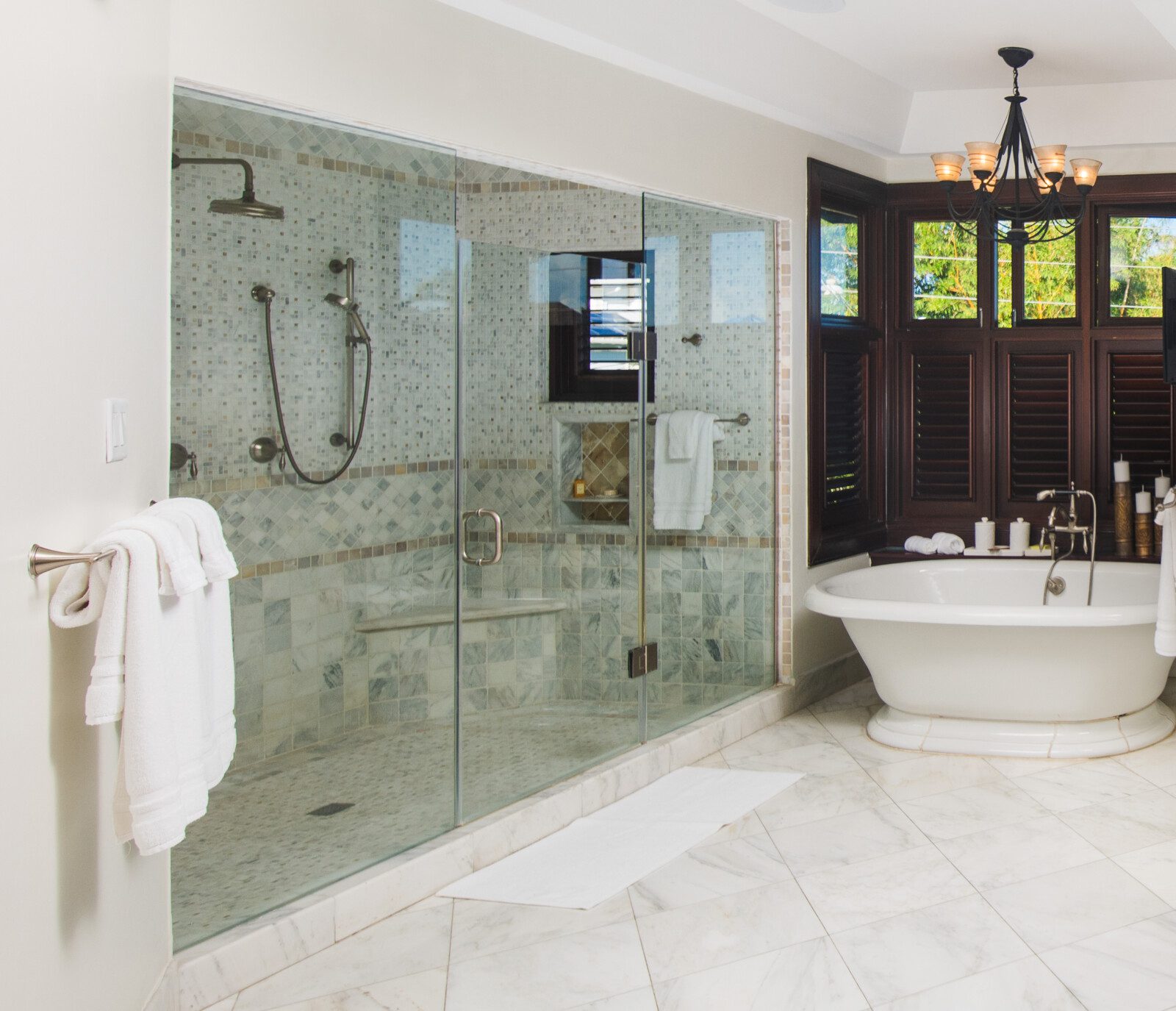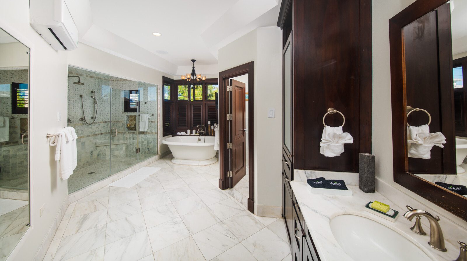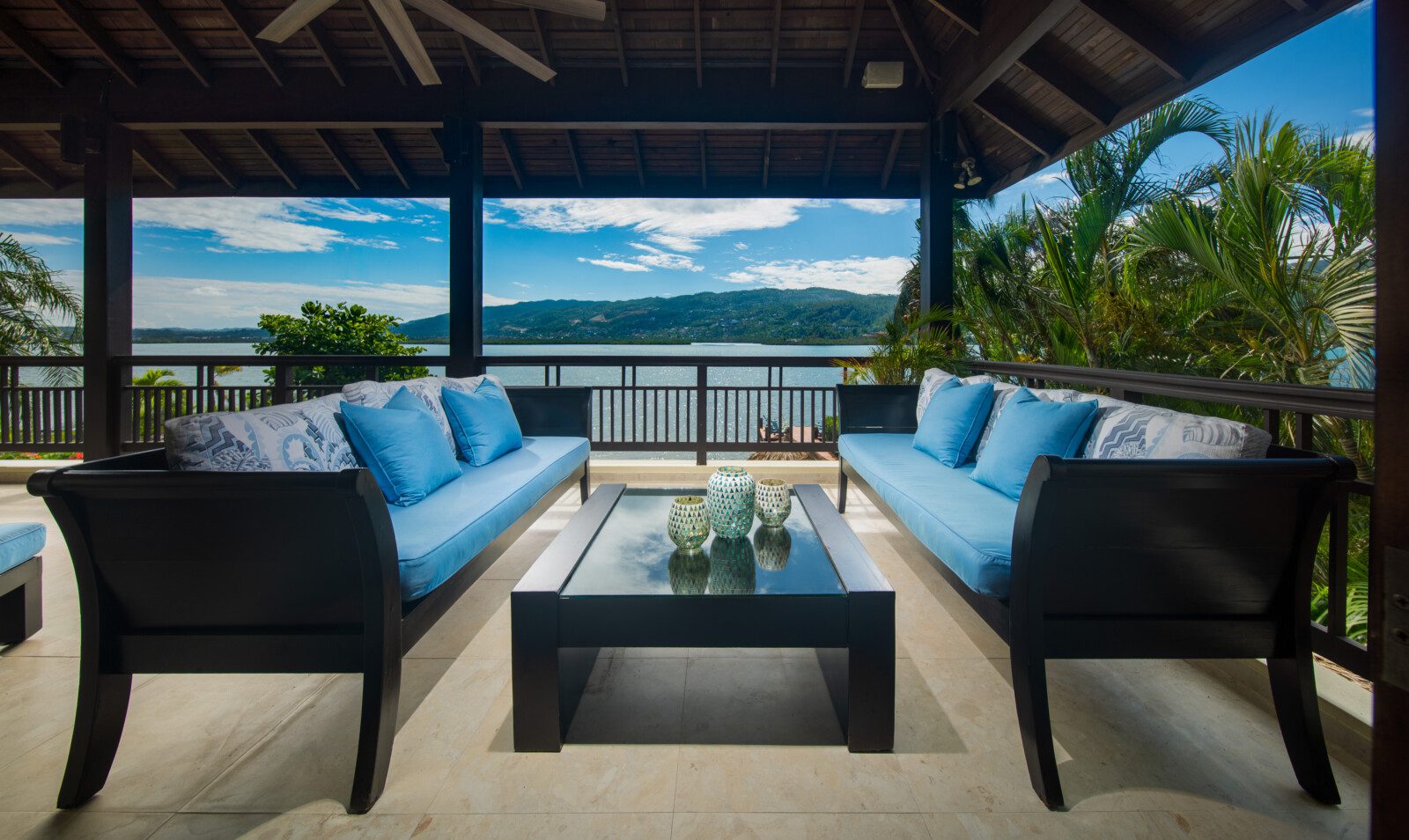 All bathrooms which are finished in natural stone, marble or granite have walk-in showers. Relax in the large master suite complete with a luxurious marble tiled bathroom with 8ft wide shower enclosure and spa-like soaking tub while watching your favorite movie on a wall mounted flat screen television. This suite opens onto a spacious upstairs patio where one can enjoy the breathtaking sunrise in the morning or have afternoon tea and wind-down to the view of the Montego Bay marine park’s lagoon with city lights as a backdrop.