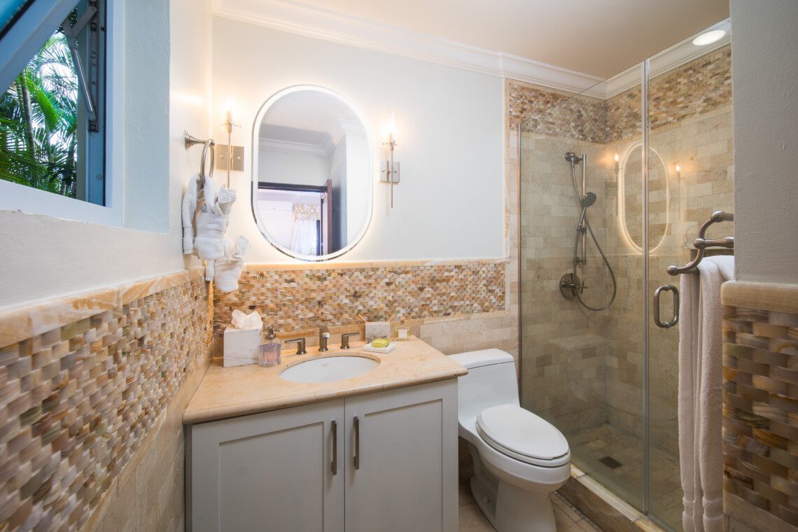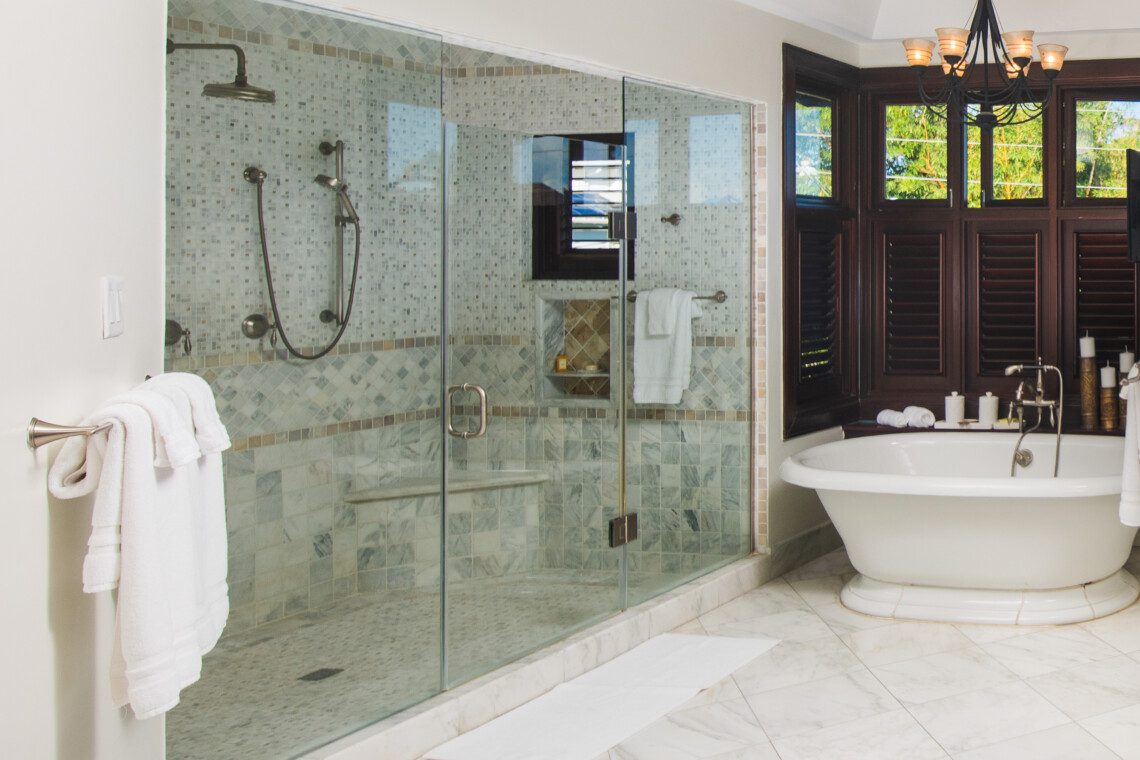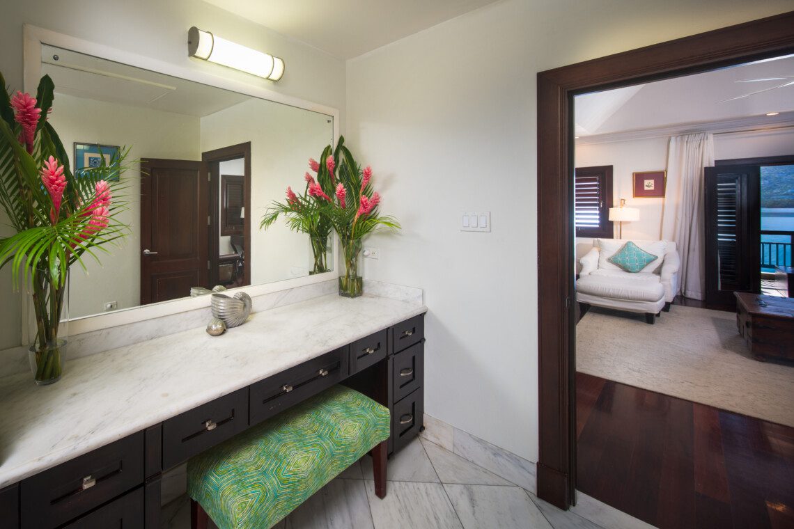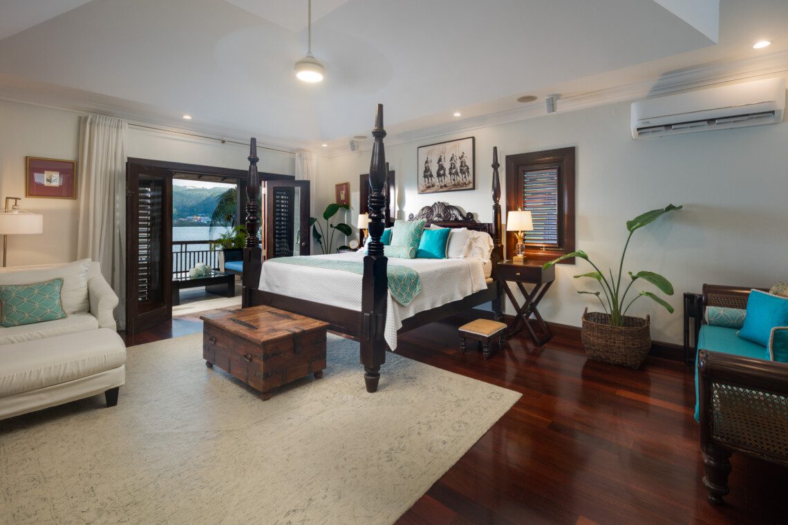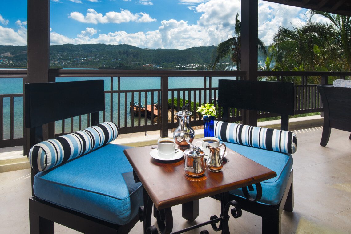 The four-bedroom villa has en-suite bathrooms and provides a picturesque view of the ocean from each room. One bedroom is on the ground floor, while the remaining three are on the first floor. All three rooms on the first floor have classic teak hardwood floors, 37’ HD LCD screens and split air conditioning. With authentic Jamaican antiques, elegant designer pieces, and original artwork, this villa stands out among luxury villas in Jamaica. All the bathrooms have marble, granite or natural stone finishes and walk-in showers.
