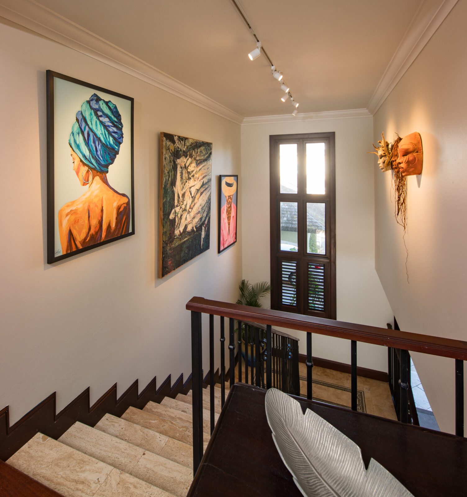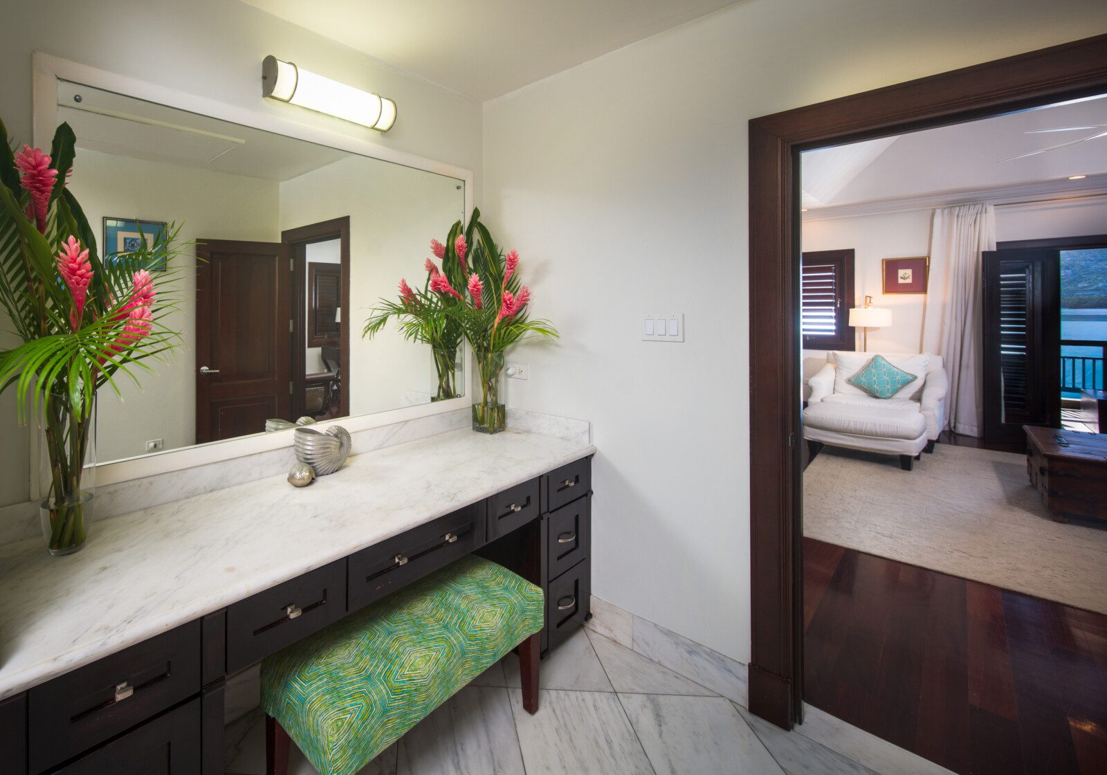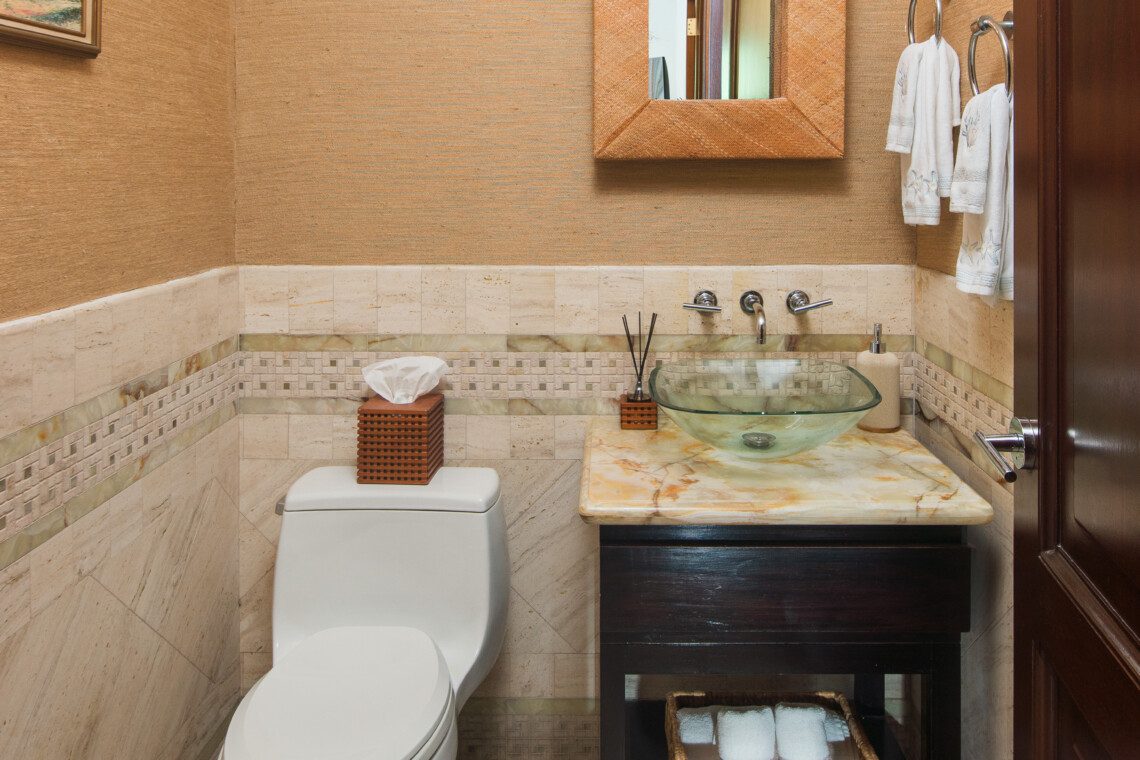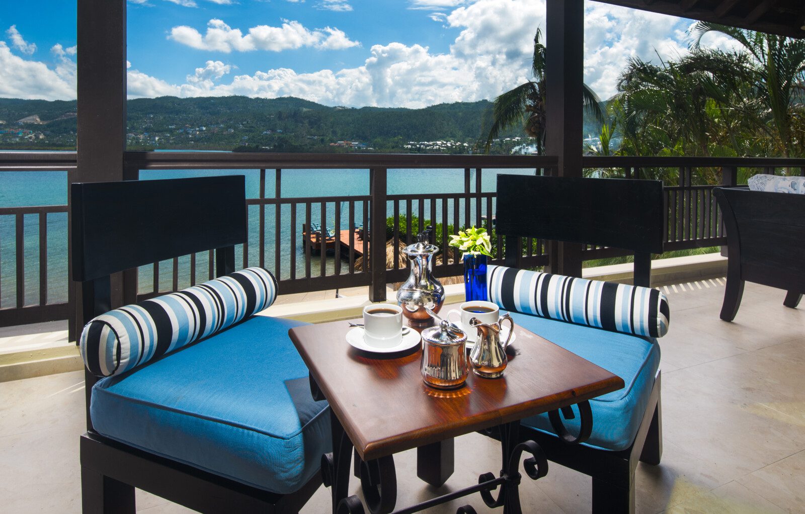 The four-bedroom villa has en-suite bathrooms and provides a picturesque view of the ocean from each room. One bedroom is on the ground floor, while the remaining three are on the first floor. All three rooms on the first floor have classic teak hardwood floors, 37’ HD LCD screens and split air conditioning. With authentic Jamaican antiques, elegant designer pieces, and original artwork, this villa stands out among luxury villas in Jamaica. All the bathrooms have marble, granite or natural stone finishes and walk-in showers.