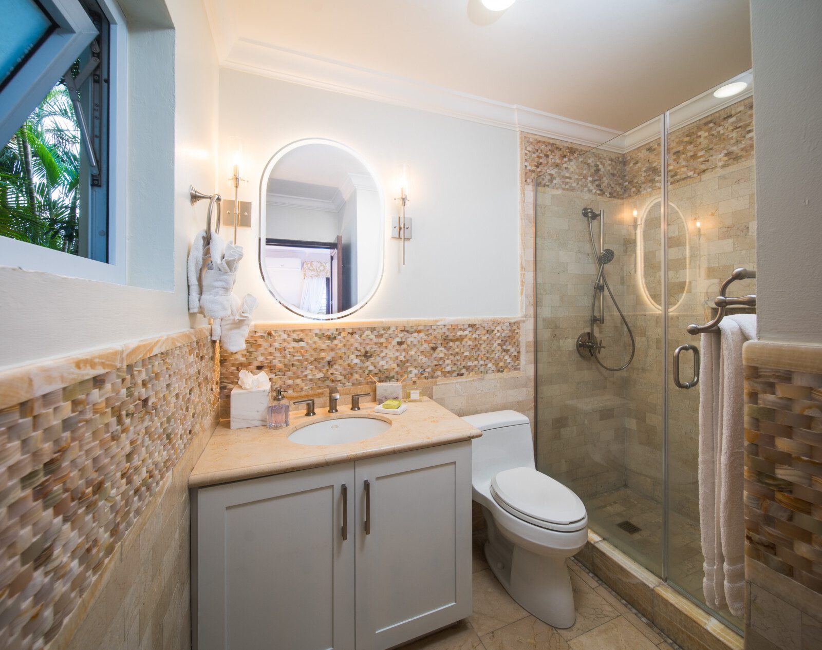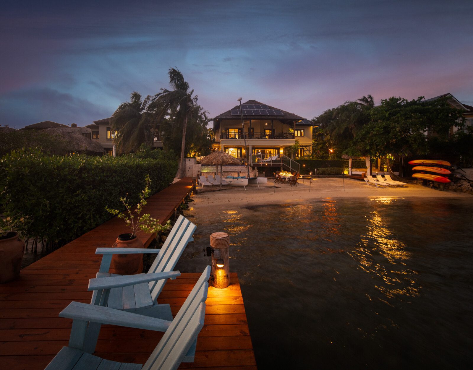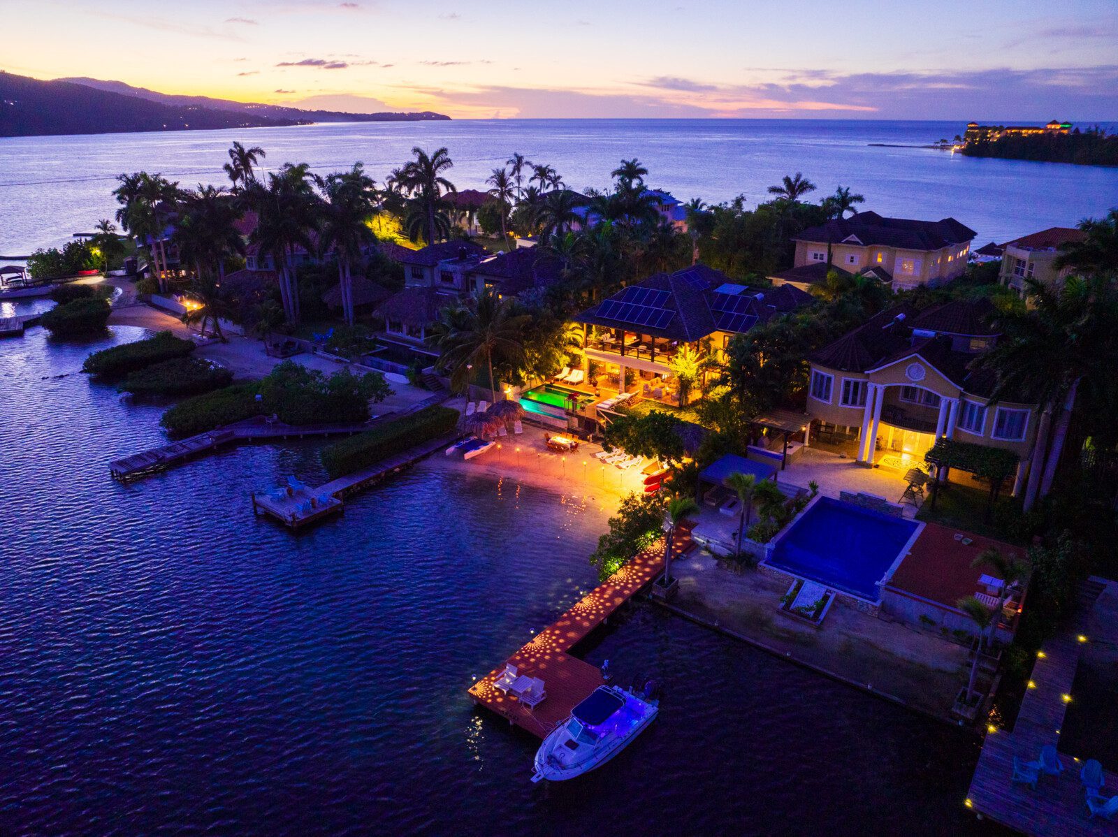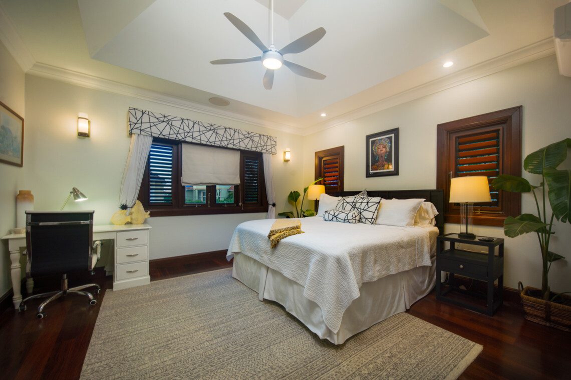 The master suite is the most luxuriant, with a classy marble tiled bathroom, 8 feet wide shower, a skylight, a spa-like tub and a wall-mounted flat-screen television for the most relaxing soak. The spacious patio is connected to the master suite. This allows for a glimpse of a gorgeous sunrise early in the morning, or for an ideal evening view of the birds in Montego Bay’s Marine Park lagoon, with the city’s lights in the background. A romantic candlelight dinner on the beach, with tiki torches all around, and a unique ocean fire-pit for the grilled meal will present a memorable experience.