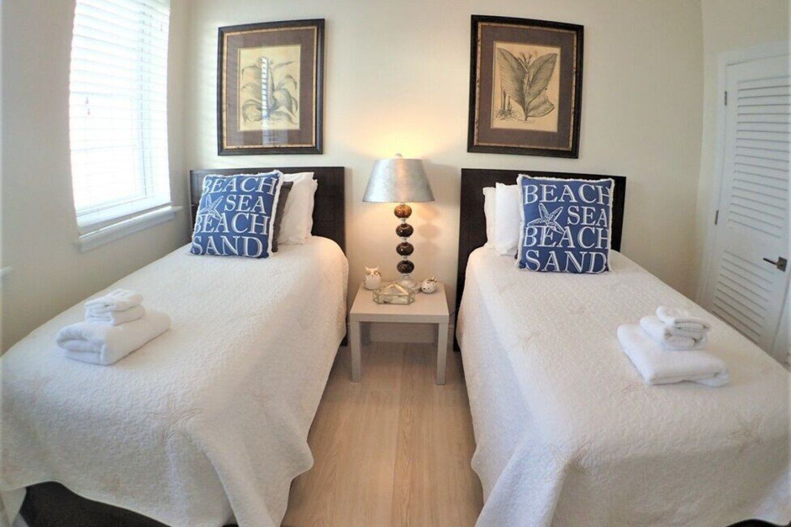 The master bedroom features a king-size bed, lovely décor and an en-suite bathroom. Step out to the balcony that looks over a beautiful pristine white sand beach and the famous Bahamian waters. There is a second bedroom on the same level and is furnished with 2 single beds. It has its own en-suite bathroom with a shower. The third bedroom on the top floor is furnished with a queen-sized bed and also has a bathroom with a shower. This bedroom has a beautiful balcony that offers wide views of the beach and the sea. The fourth bedroom shares the bedroom 3 bathroom and has double bed and a futon bed.