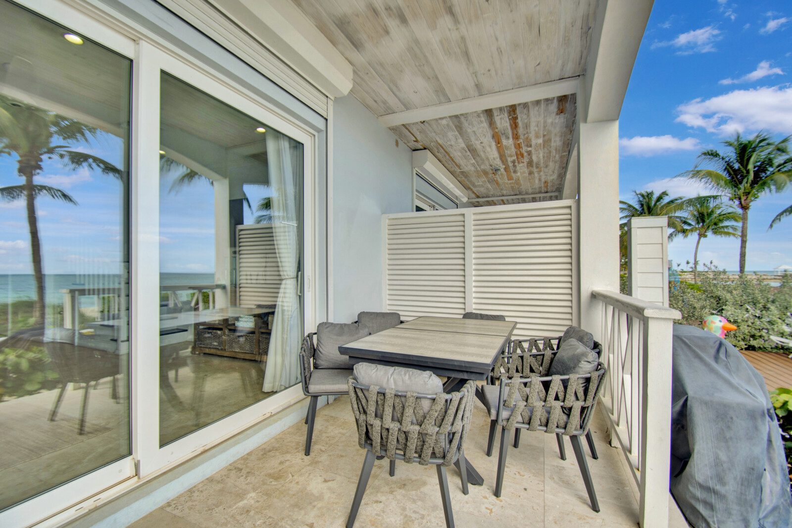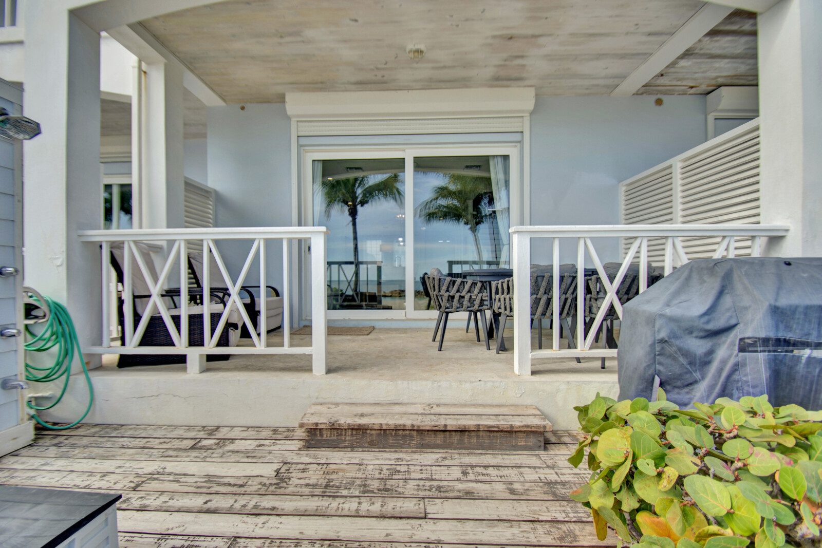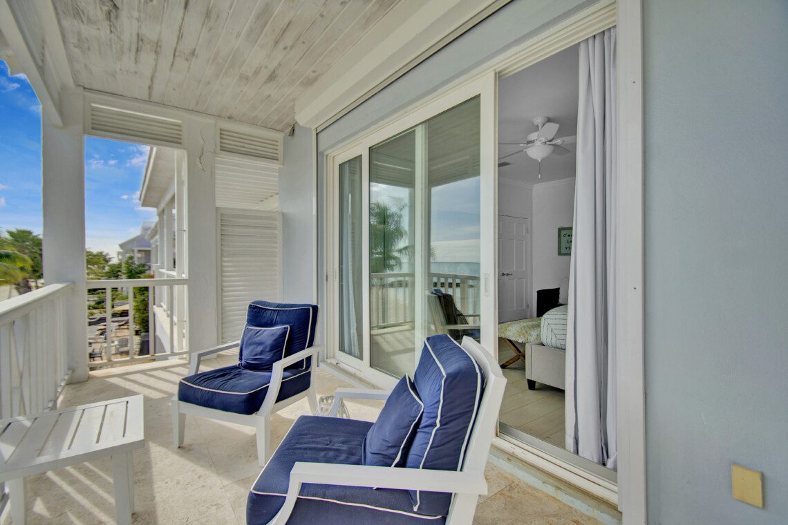 The layout is open and bright having an expansive balcony and beachfront porch with outdoor lounging and comfortable cushioned furniture.