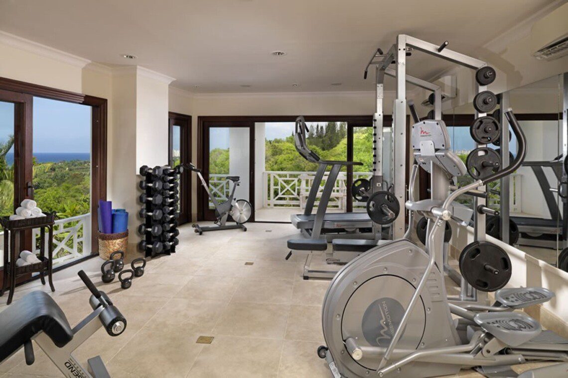 • Fully equipped gym (including incliner trainer treadmill, double-sided half-cage with Olympic bars and weights with bench, elliptical bike cybex trainer, cable cross, punch kettle bells, yoga mats and fitness balls)