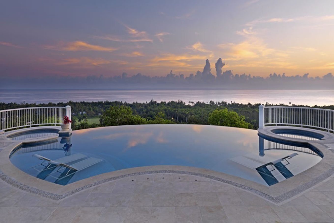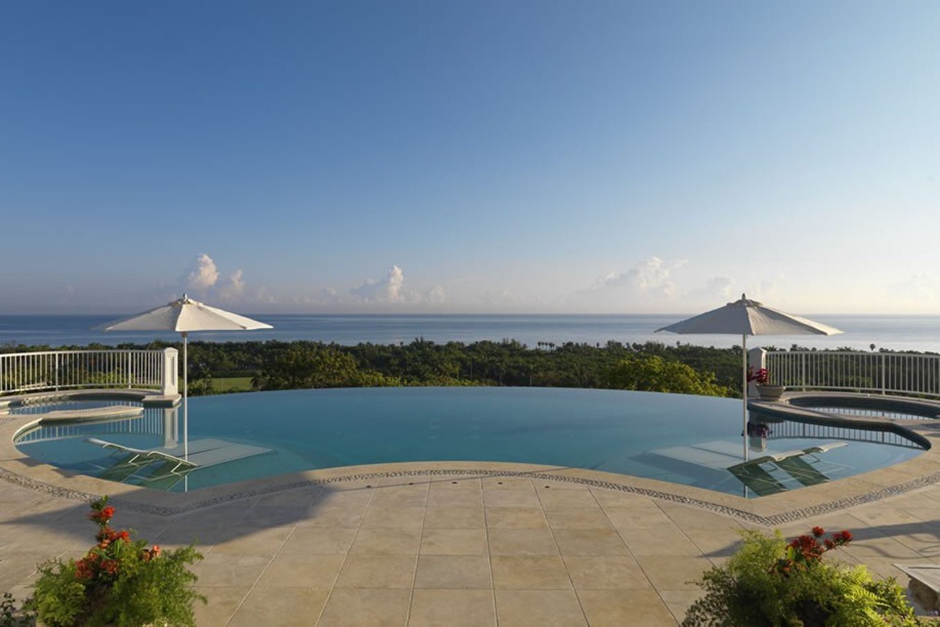 • Large infinity pool (55’ x 30’ ft) flanked by jetted hot tub and still cool tub