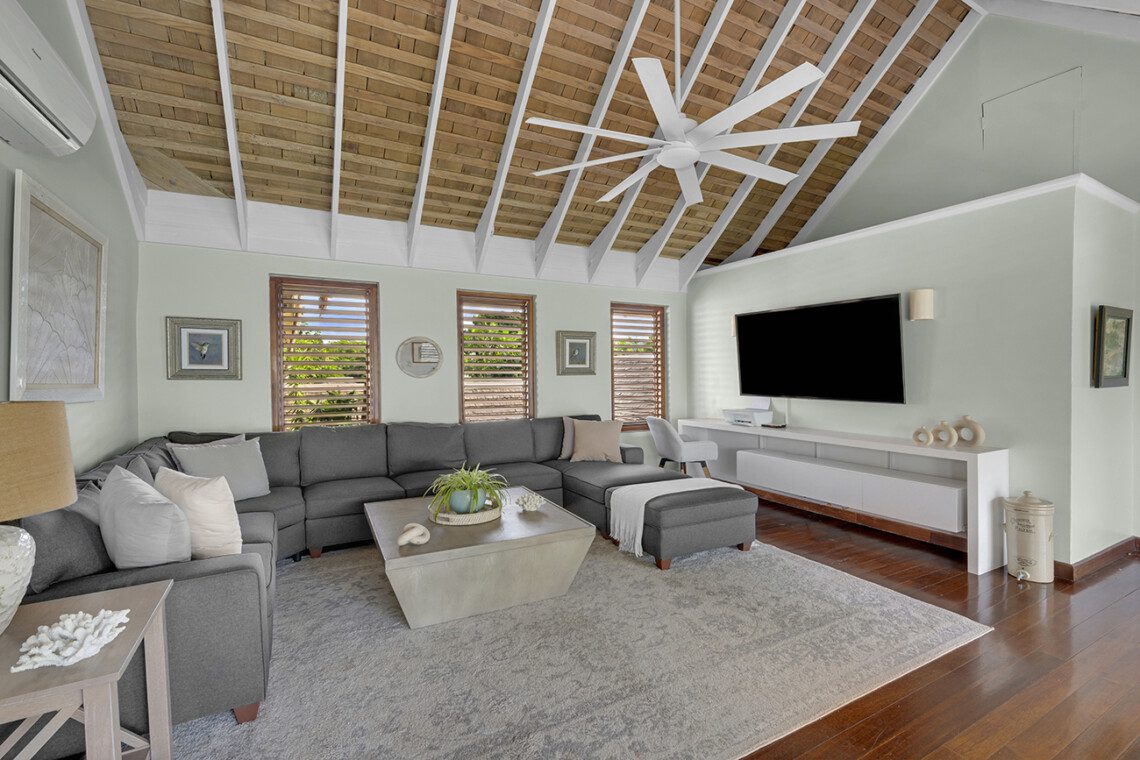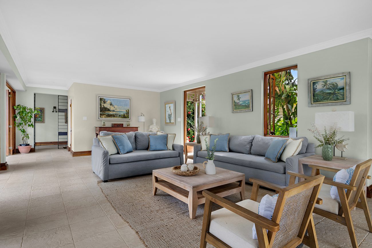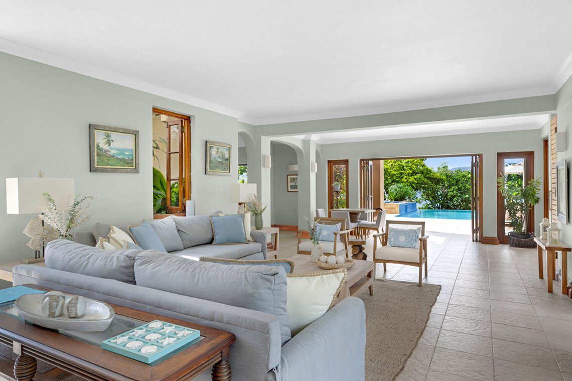 Living room, verandah, bar with television, sound system, outside dining areas, inside formal dining room, kitchen with 6-burner gas stove, walkway to staff quarters. All rooms open to a wide stone terrace, swimming pool, and hot tub. Four steps down to the lawn, three steps down to the main beach on the bay. Across the lawn, four steps down to two more beaches on the sea.