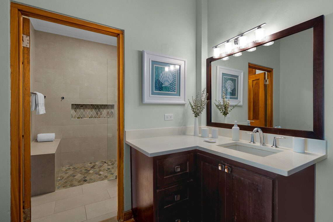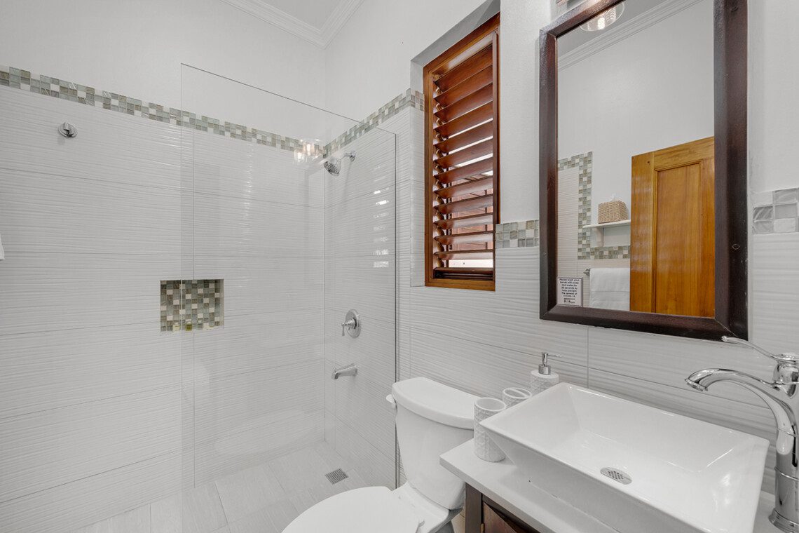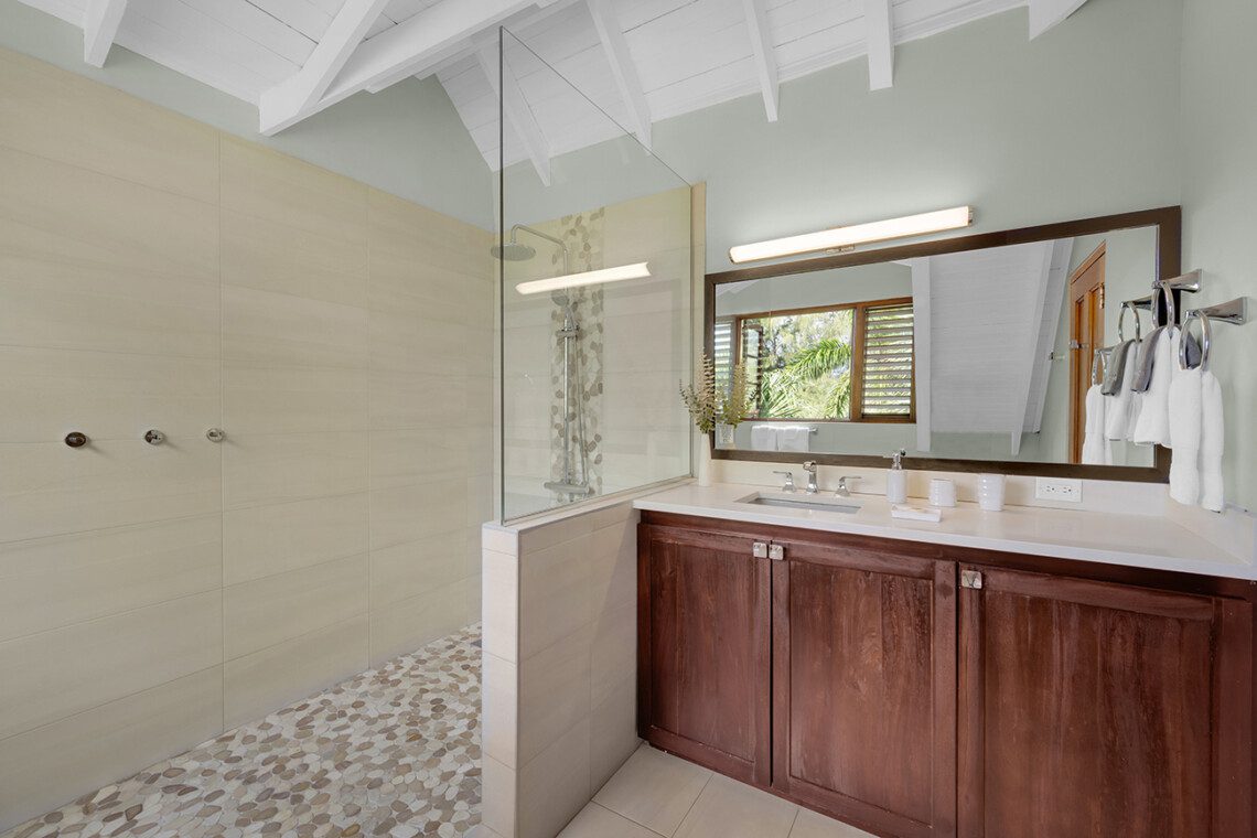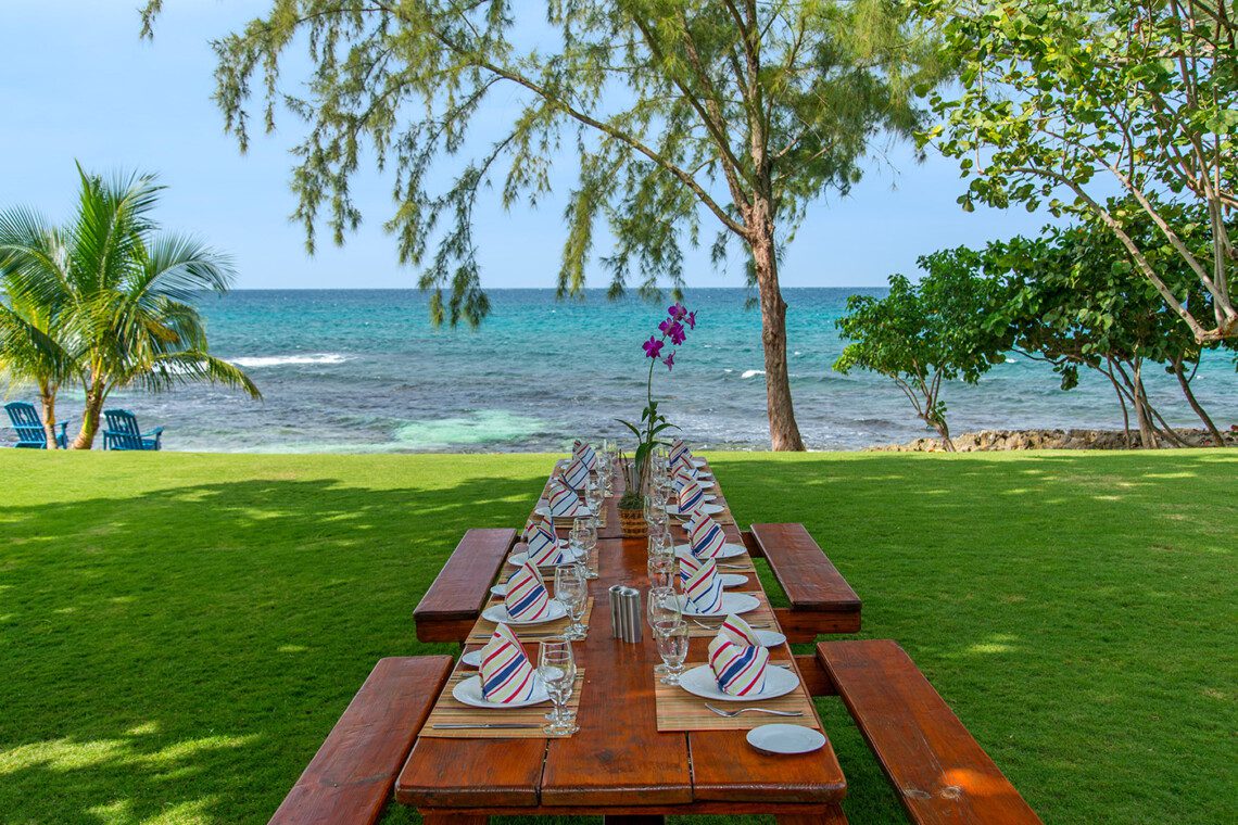 Living room, verandah, bar with television, sound system, outside dining areas, inside formal dining room, kitchen with 6-burner gas stove, walkway to staff quarters. All rooms open to a wide stone terrace, swimming pool, and hot tub. Four steps down to the lawn, three steps down to the main beach on the bay. Across the lawn, four steps down to two more beaches on the sea.