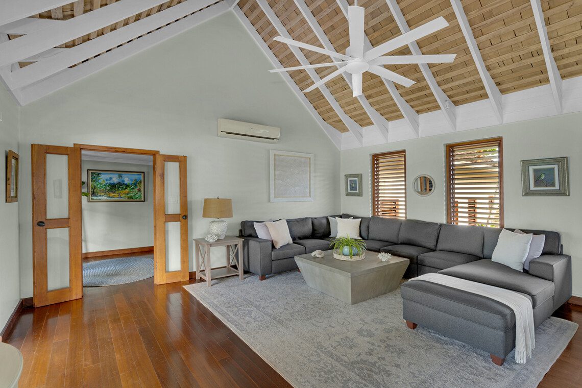 FORTLANDS POINT VILLA, once the site of an old stone fort, sits a remarkable Premier home named Fortlands Point. From its breathtaking location on the tip of the peninsula, the commanding view encompasses the turquoise water of Discovery Bay on one side and the deep blue Caribbean Sea on the other. The views are simply magnificent. The clear buoyant water and adjacent reefs are a paradise for snorkelers and divers. Just a few feet from the point, the protected reefs are a colorful coral world of Jackfish, Parrot Fish, Wrass, and Sergeant Majors. The stereophonic sound of waves lapping the coral and beaches lulls guests to sleep each night.