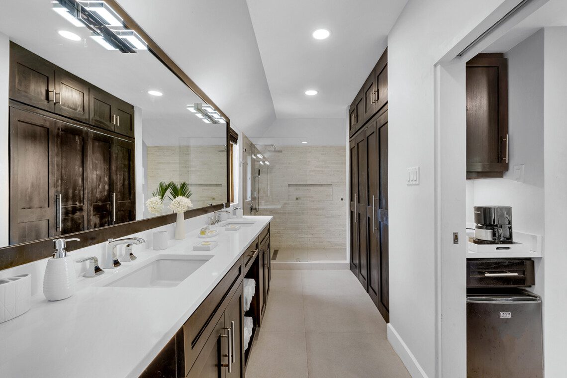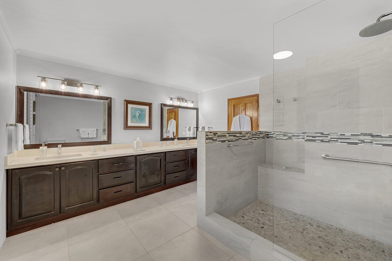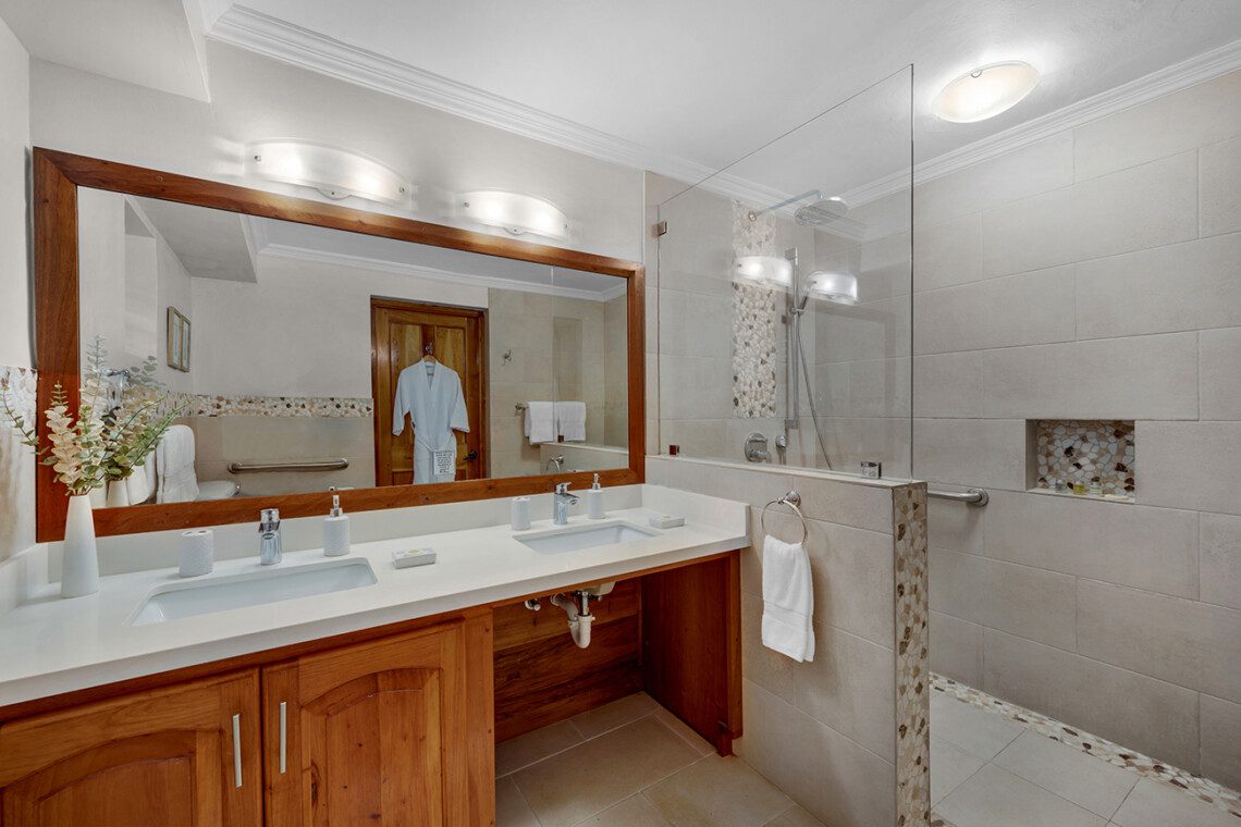 King-sized bed with ocean view balcony, en-suite bathroom with walk-in shower, and double vanities