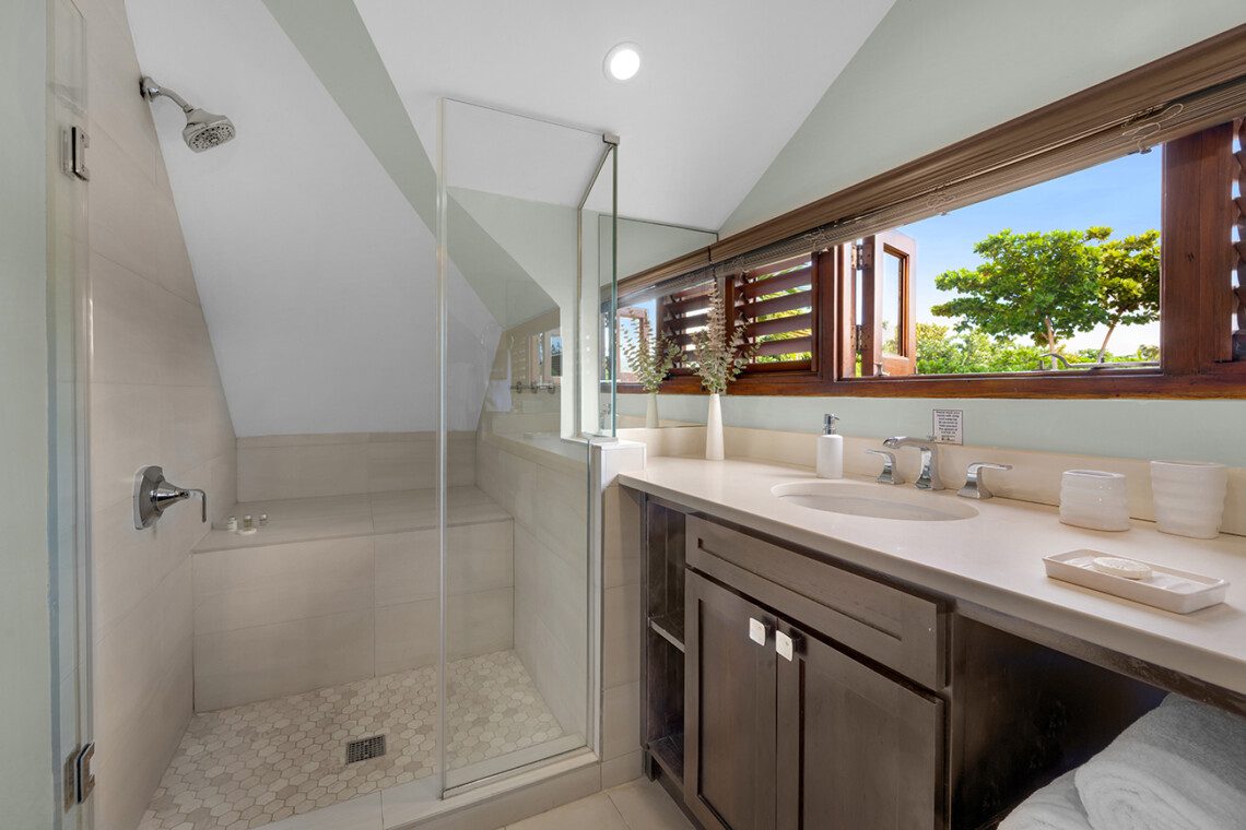 Large loft bedroom under the high peaked ceiling. King-size bed, walk-in closet, and spacious bathroom with large walk-in shower (big enough for two) Sea view from bedroom, bathroom, and shower