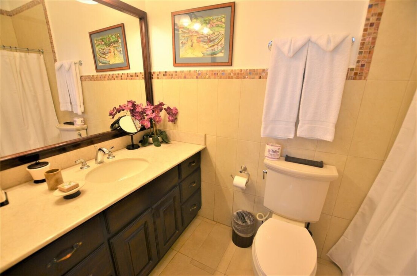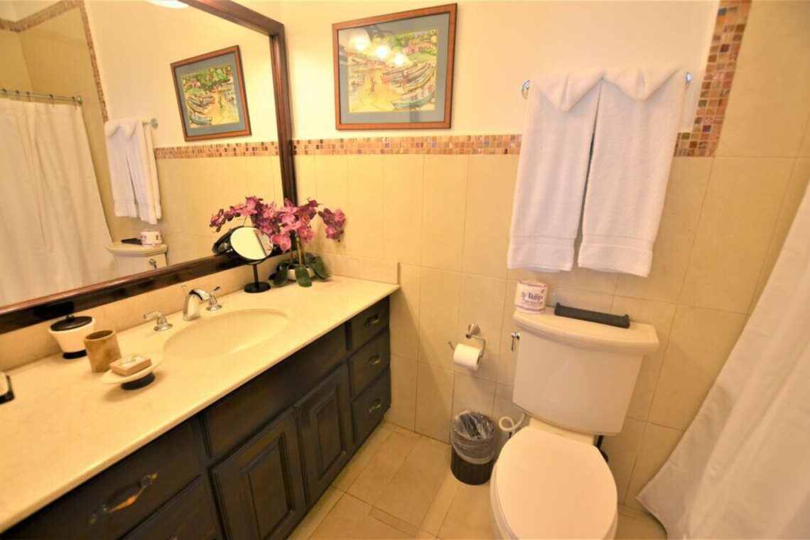 Bedroom 5 Optional king size or twin beds, private bathroom. This room is on the other side of the house from the other bedrooms. There is a small den that is next to this bedroom with a 32″ flat screen TV. The outdoor dining area adjoins this area.
