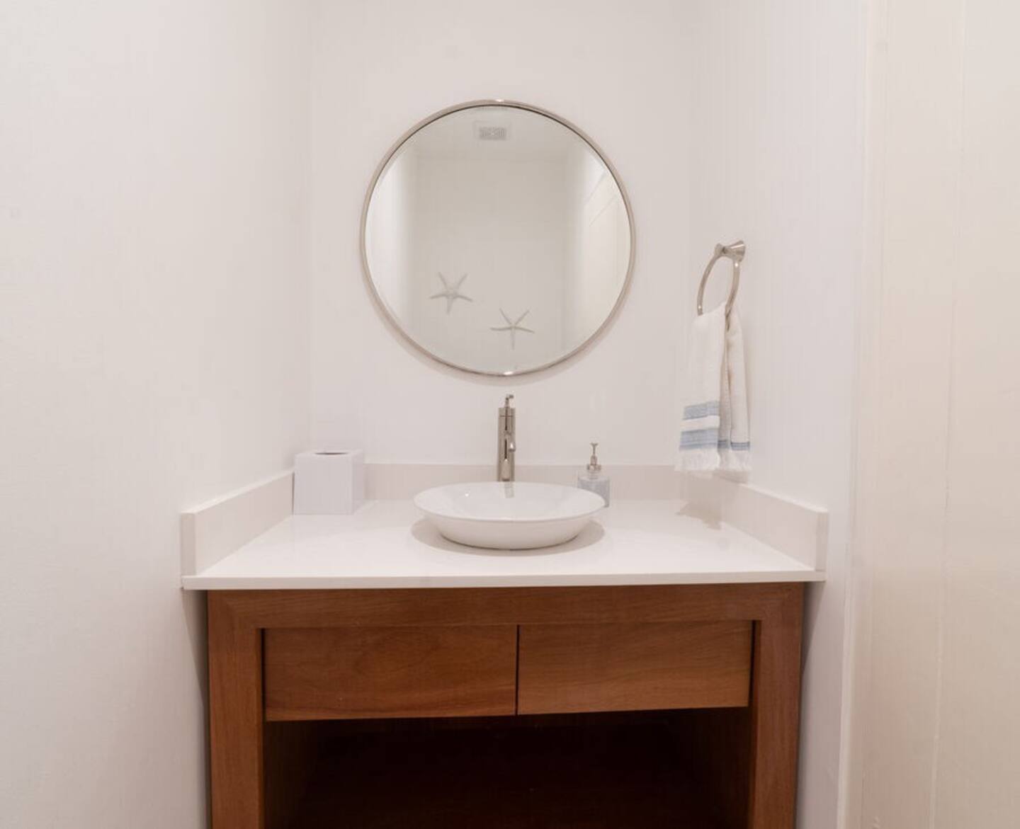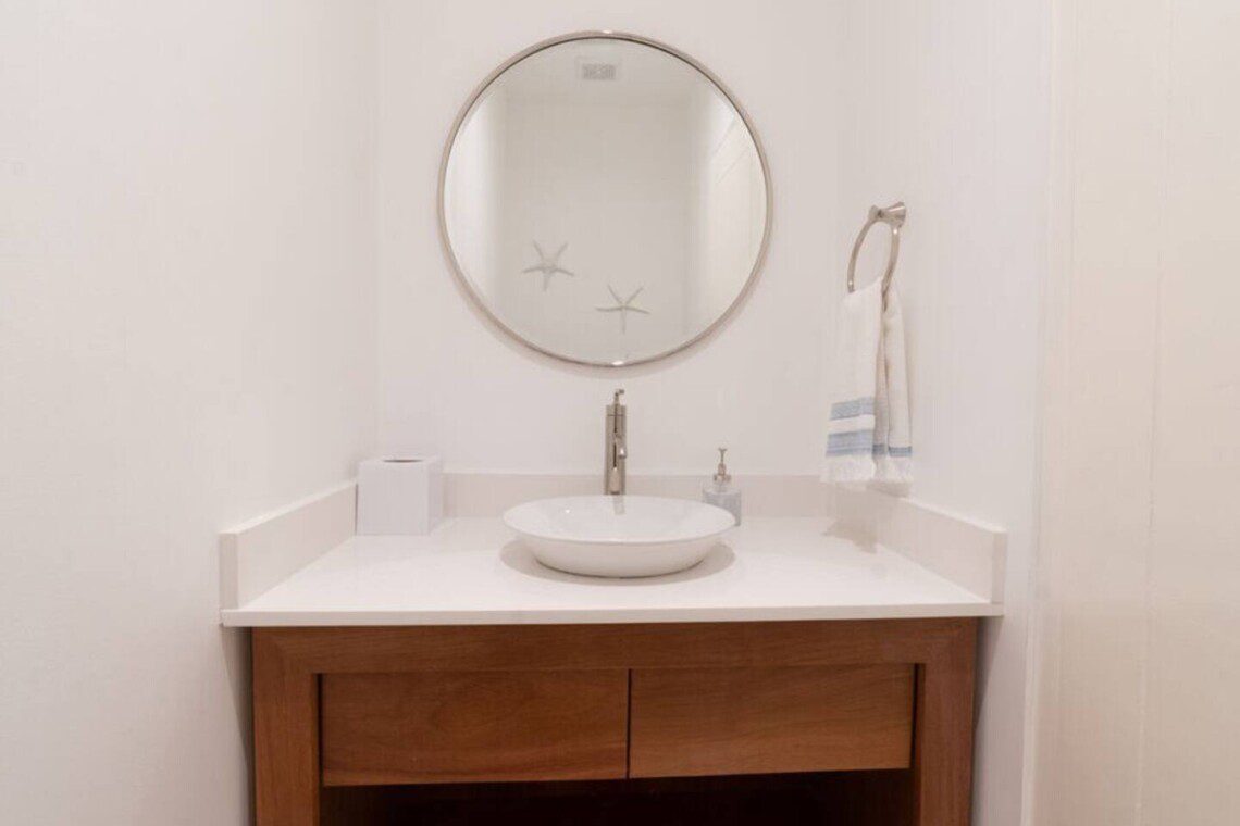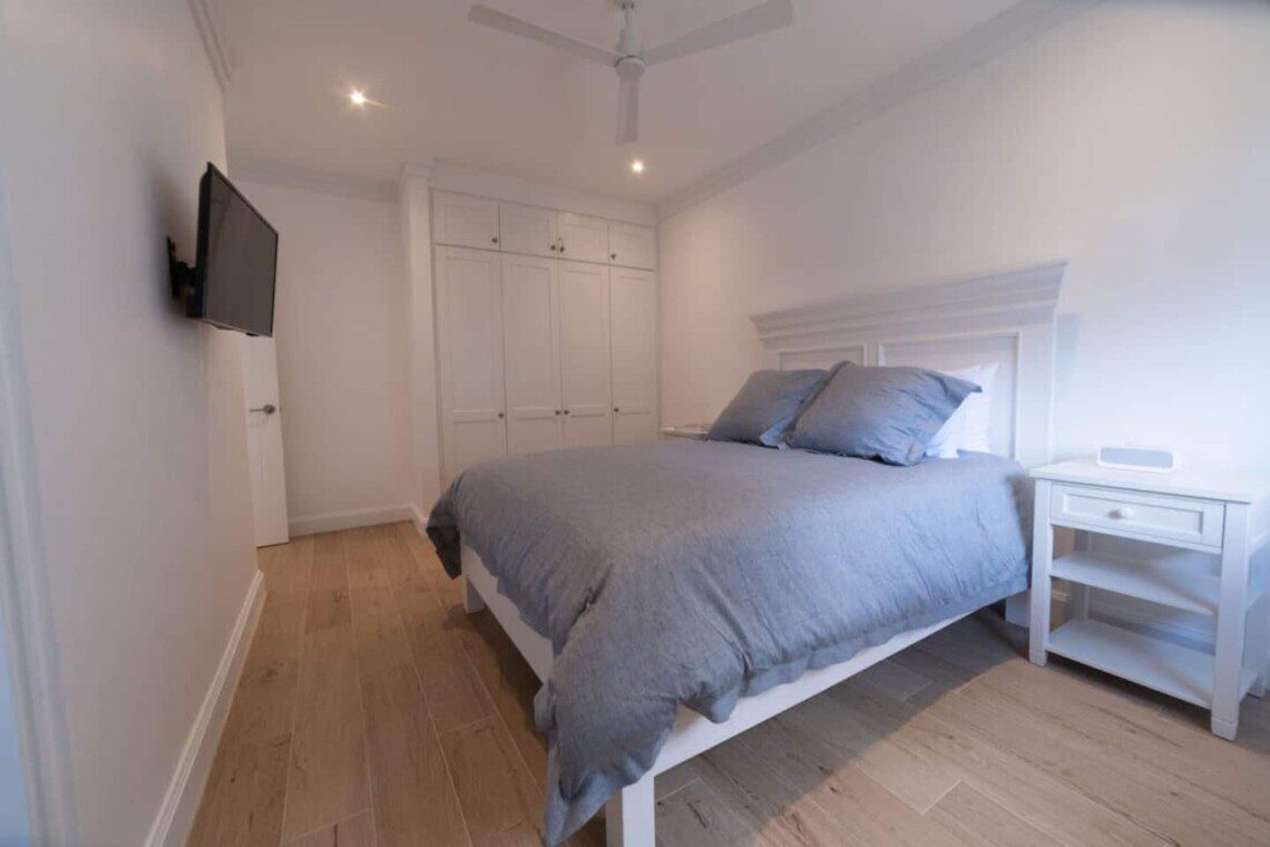 Bedroom 4 (front of the house by the front door)- Queen size bed, a two seater couch, a window with roman shades that looks out to the street/next door neighbor. There is a three window with roman shades next to the bed and that has an ocean view. The room has a ceiling fan, can lights, one bedside table, A.C., a television with an apple TV and a DVD player with a few Disney movies. That room does not have a cable box but you can view Netflix on it. It has a closet with drawers and a rod to hang up clothes, a mini security safe, a blow dryer and a suitcase rack. The bathroom door is a barn door. Wood porcelain tiles and limestone bathroom floors.