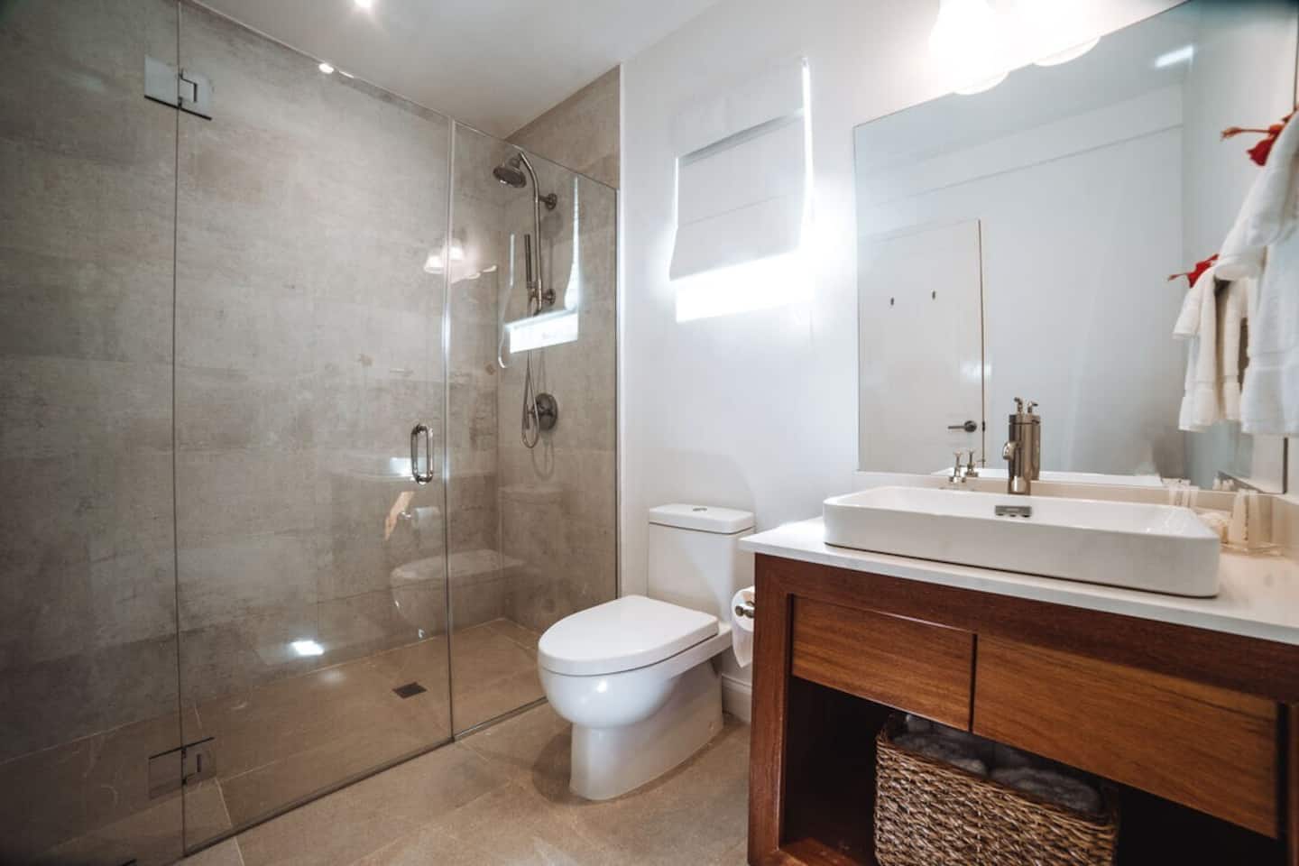 Bedroom 2- Has a king size bed. One bedside table, can lights, no window, a nice size closet which has a set of drawers and a rod to hang clothes. It also has a mini security box, a suitcase rack and a blow dryer. The room comes with a ceiling fan, A.C. and television with a cable box. The bathroom has a shower only, a single sink and a window with roman shades which overlooks the next door neighbor’s house. Glass enclosure shower. Wood porcelain tiles on the floor and limestone on the bathroom floor.