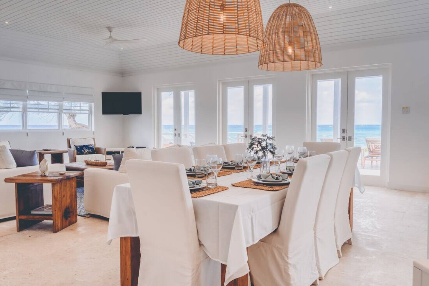 The main room has a console table, two end tables, a buffet table, a coffee table, a rug and two poufs. The dining table that seats 8 persons, an AC cassette and one ceiling fan finish out the main room. A three window(front entrance)with roman shades which overlooks the ocean and the clubhouse. Also in the main room, there is a television with Flow for our telephone and cable service. There are board games, scrabble a backgammon game, playing cards for adults and children. A play station 4 with a few games and two game controllers. In the dining room, There is an indoor dining table that seats 8 persons, I would say overall the entire house has a cozy and comfortable laid back feel.