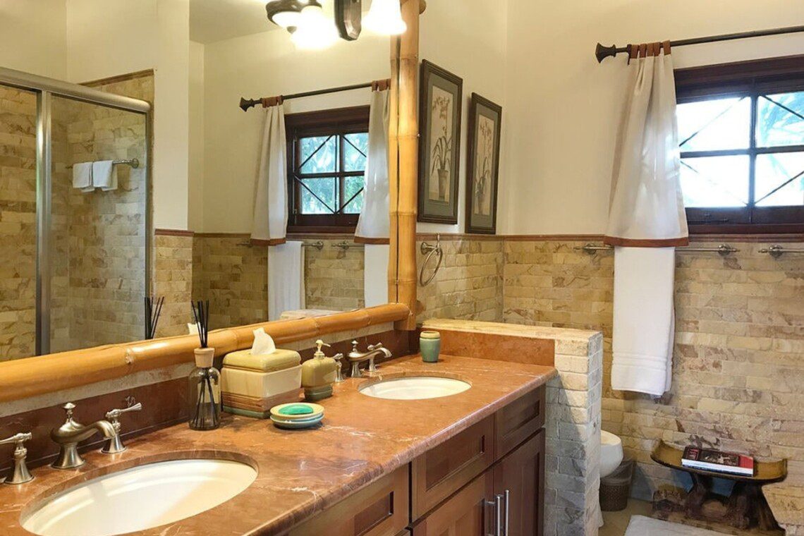 Three bedrooms are in the main house ~ two upstairs, and one downstairs. Three additional bedrooms are in the cottage just behind the main house and adjacent to the tennis court.