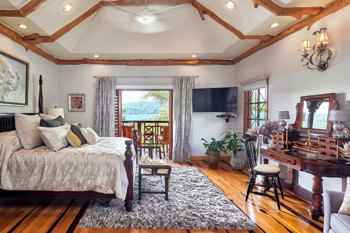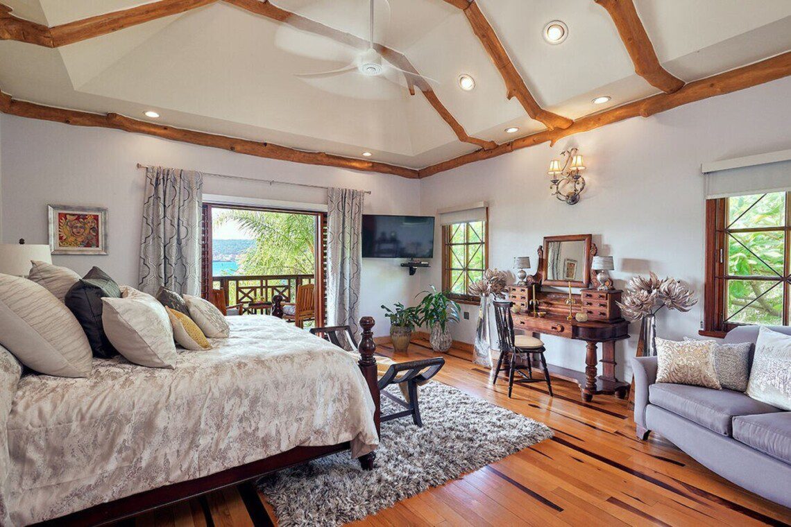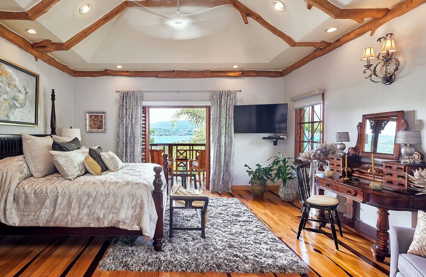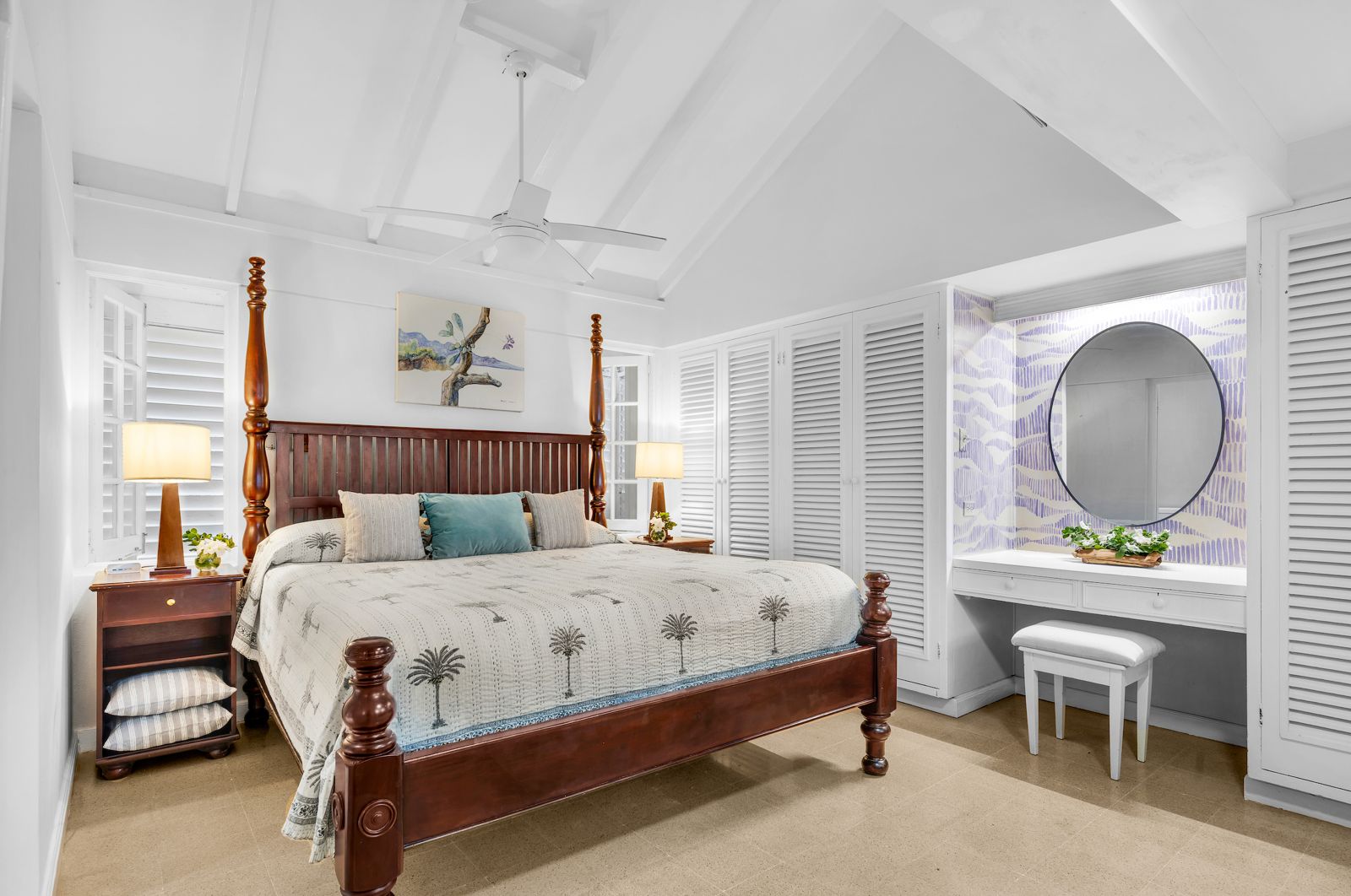 Upstairs. King-size bed; en-suite bathroom with tub-shower combination. View of grounds, pool, and bay.