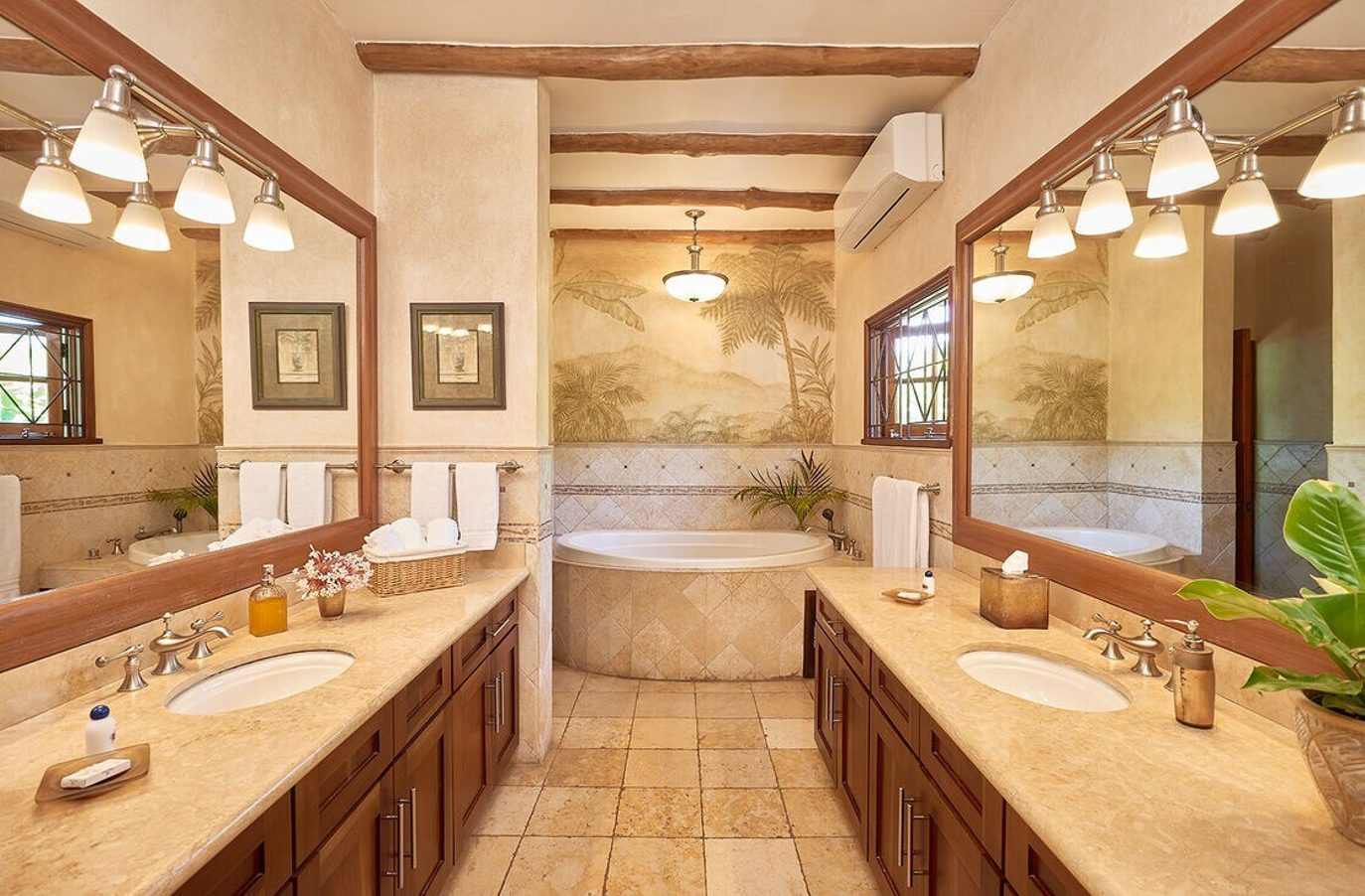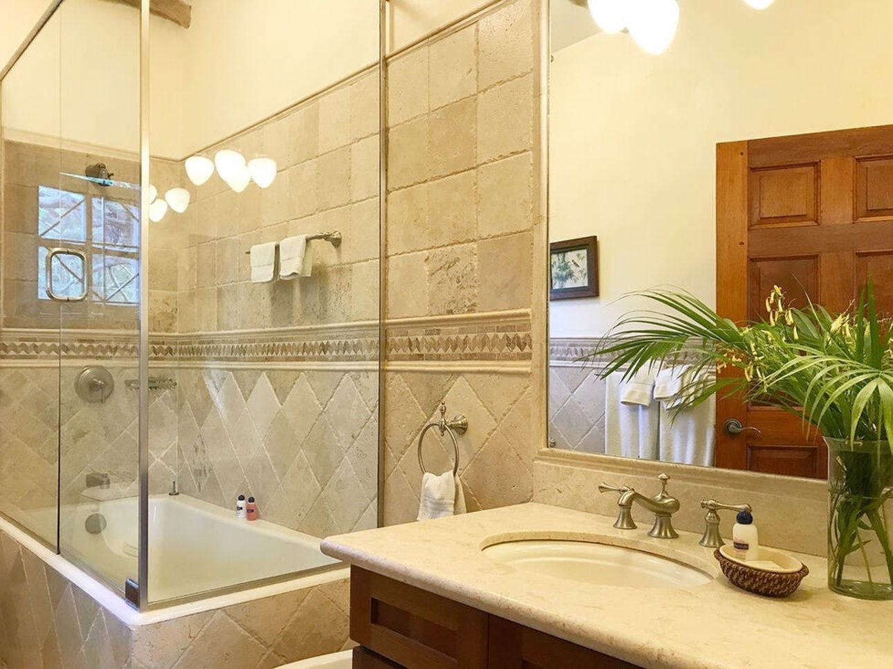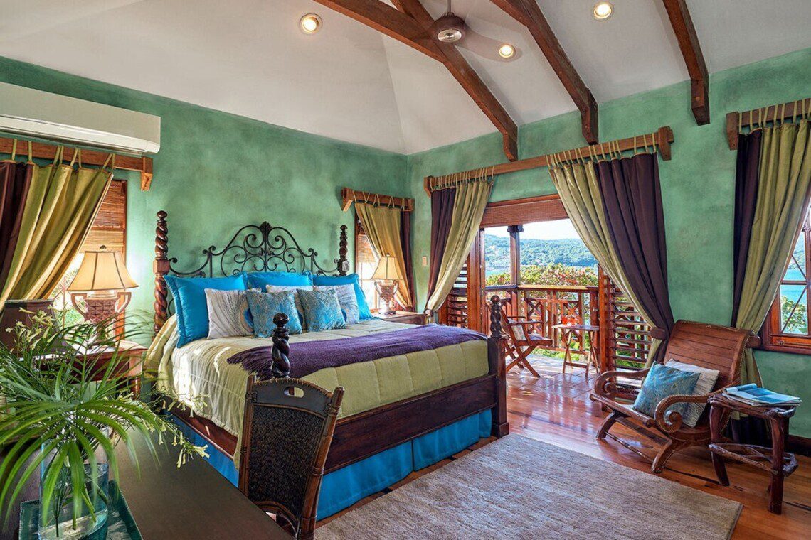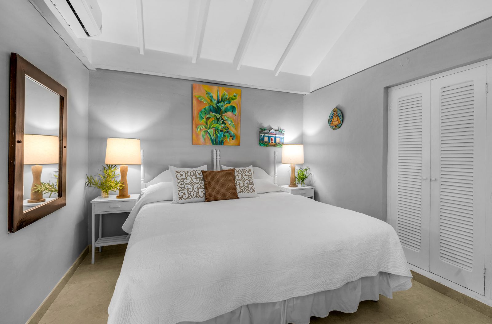 Upstairs. King-size bed; en-suite bathroom with tub-shower combination. View of grounds, pool, and bay.
