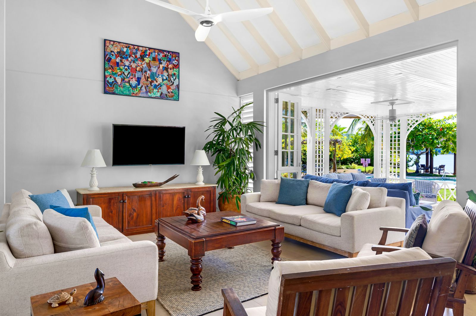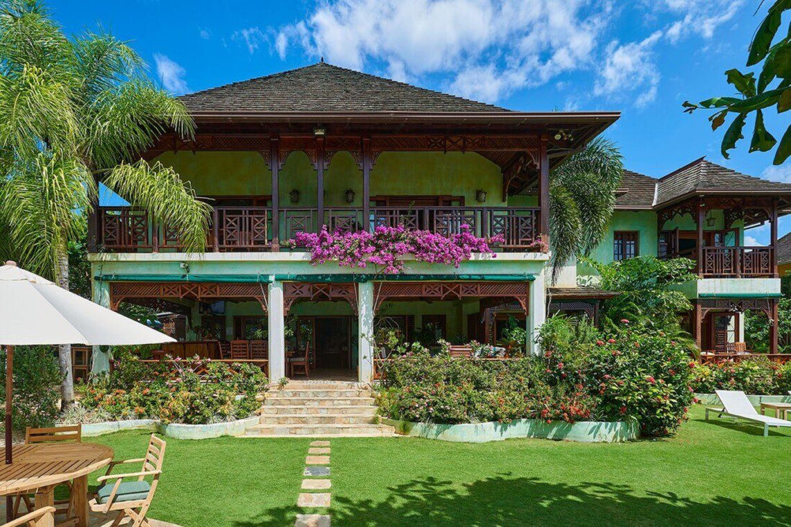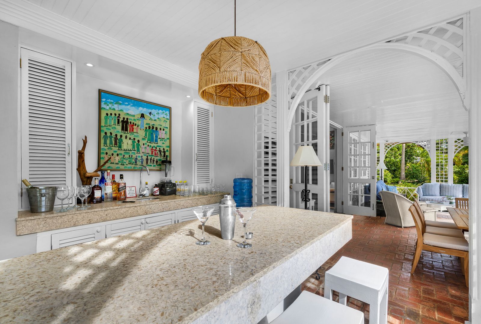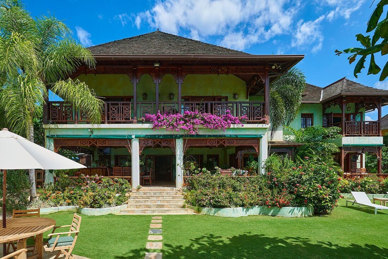 On its own sugary white sand beach lapped by the clear turquoise waters of Discovery Bay sits the charming home Sea Grapes. The translucent azure waters here are excellent for swimming and kayaking. Surrounding the swimming pool is a spacious, grassy lawn, wonderful for children and games. Behind the house is the private tennis court, which can be lighted for night play.