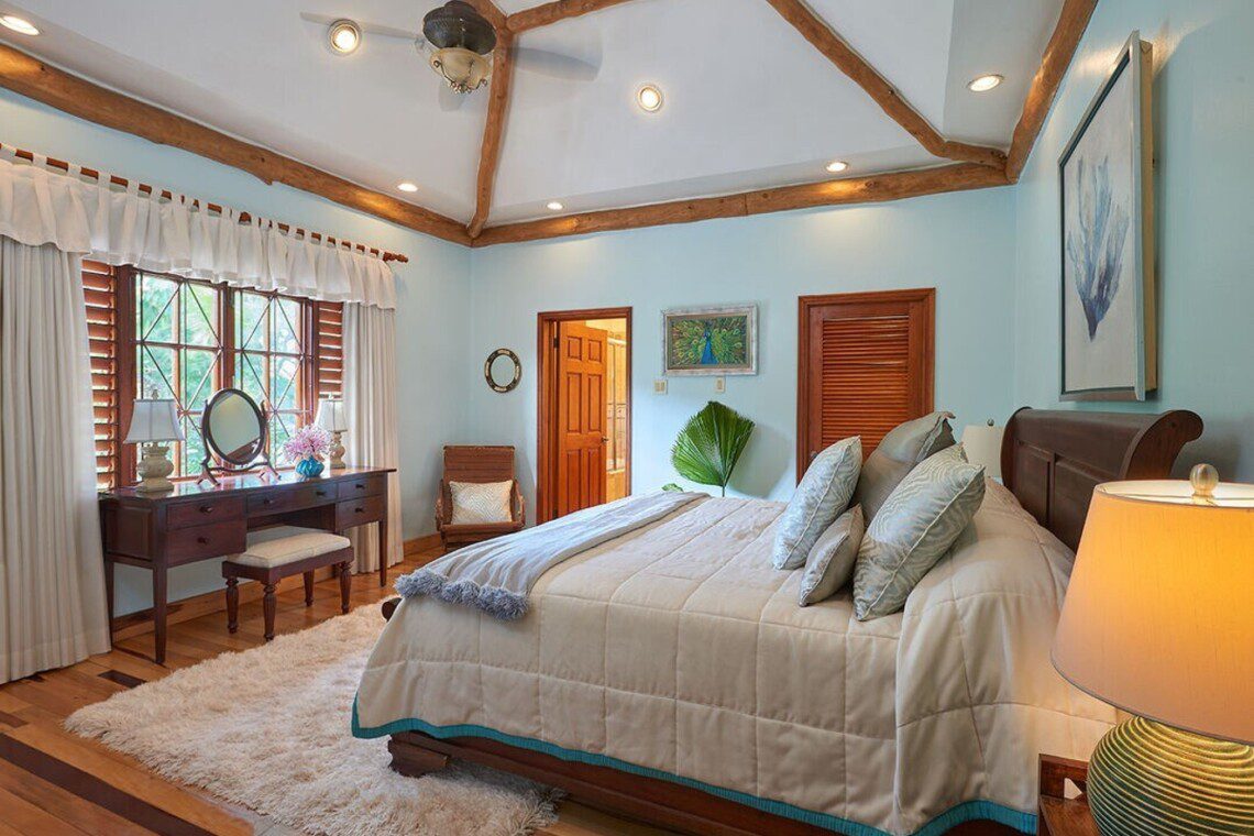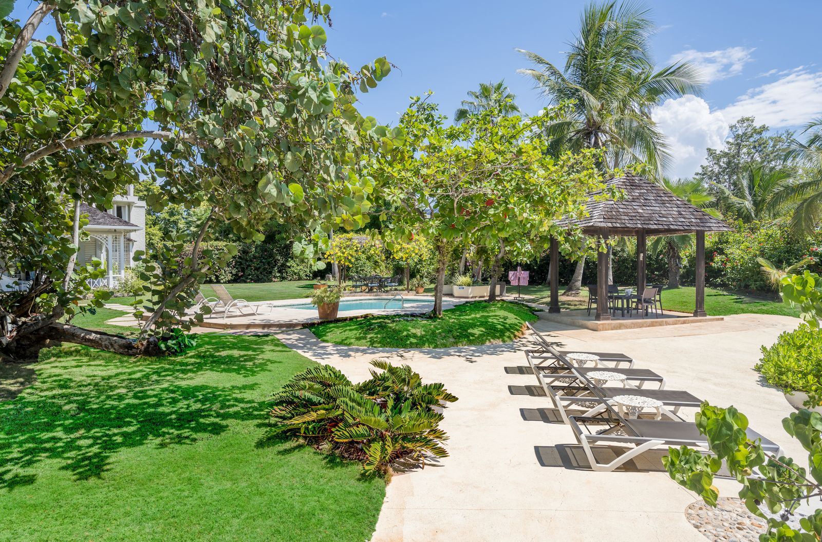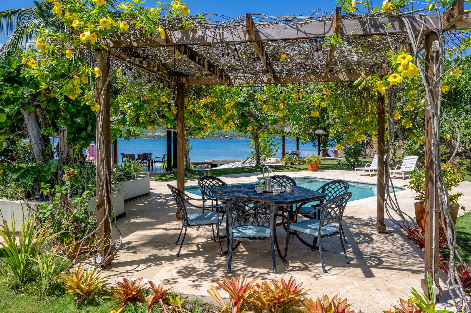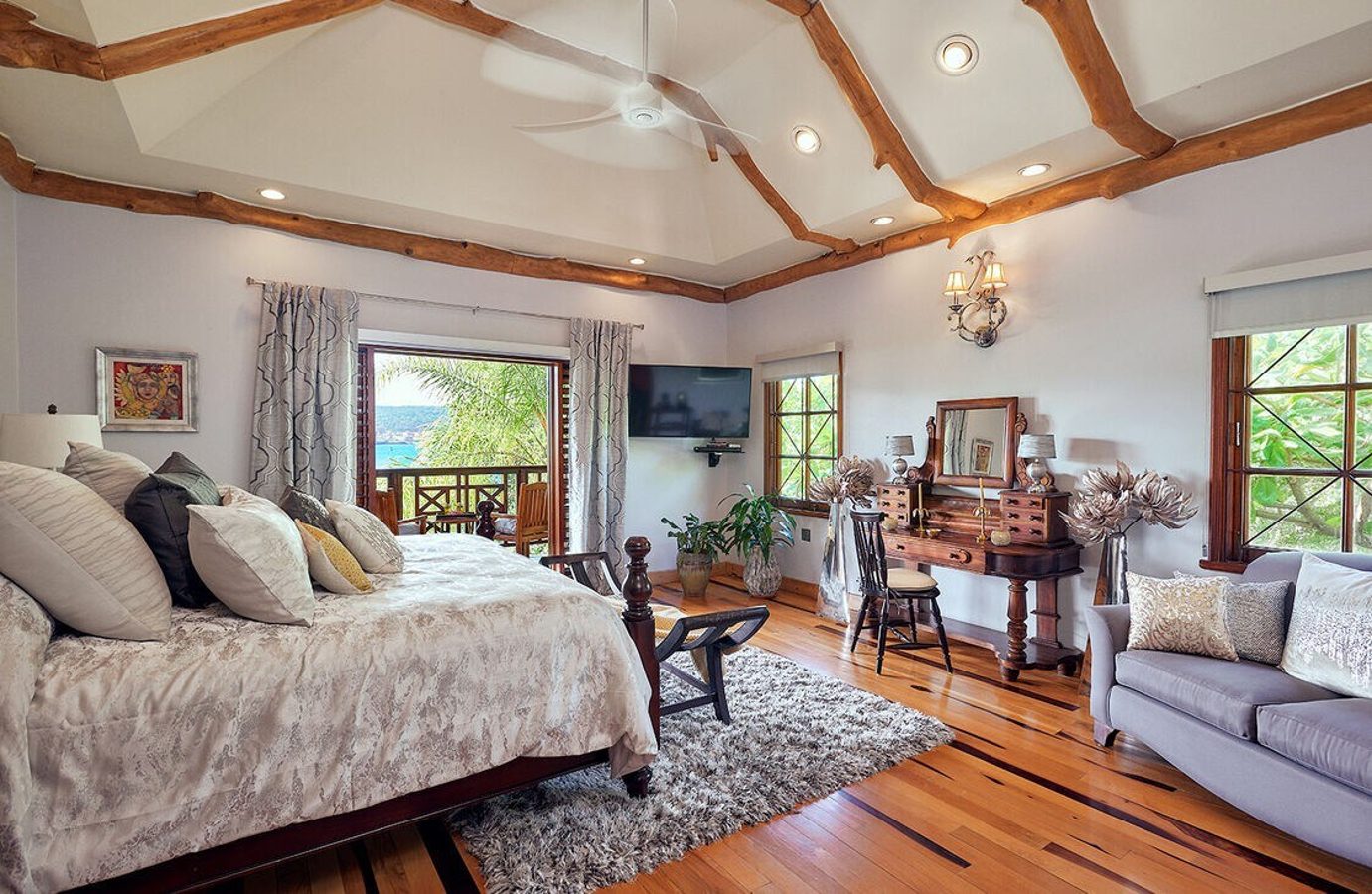 On its own sugary white sand beach lapped by the clear turquoise waters of Discovery Bay sits the charming home Sea Grapes. The translucent azure waters here are excellent for swimming and kayaking. Surrounding the swimming pool is a spacious, grassy lawn, wonderful for children and games. Behind the house is the private tennis court, which can be lighted for night play.