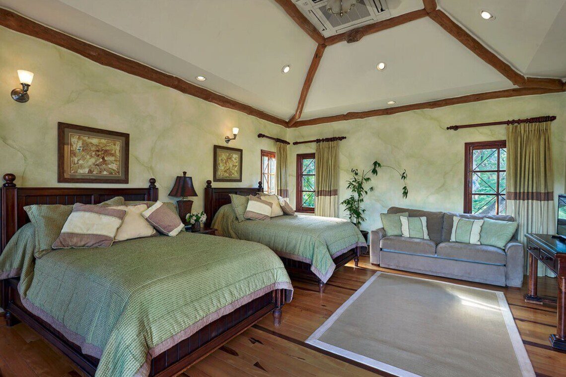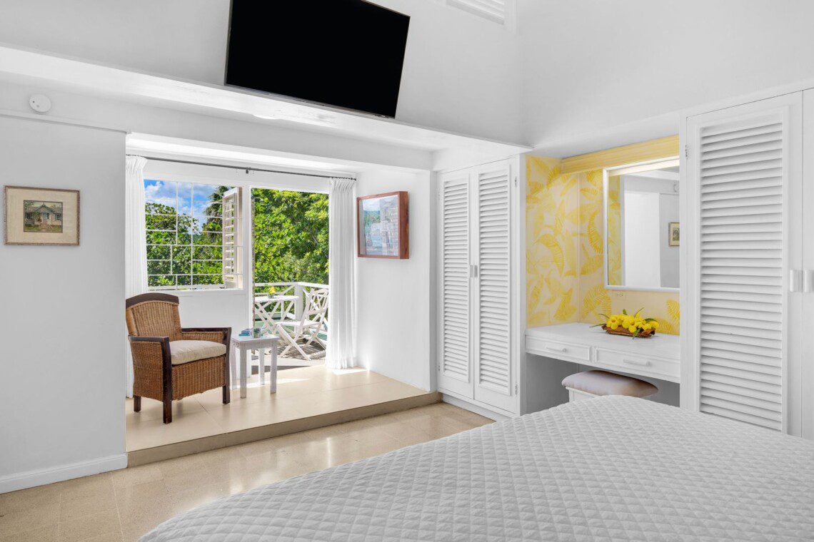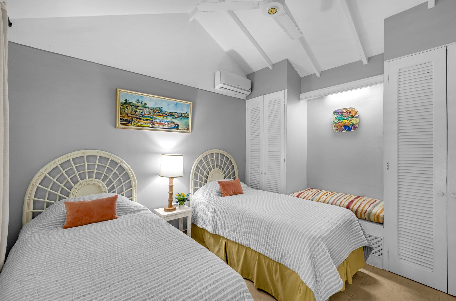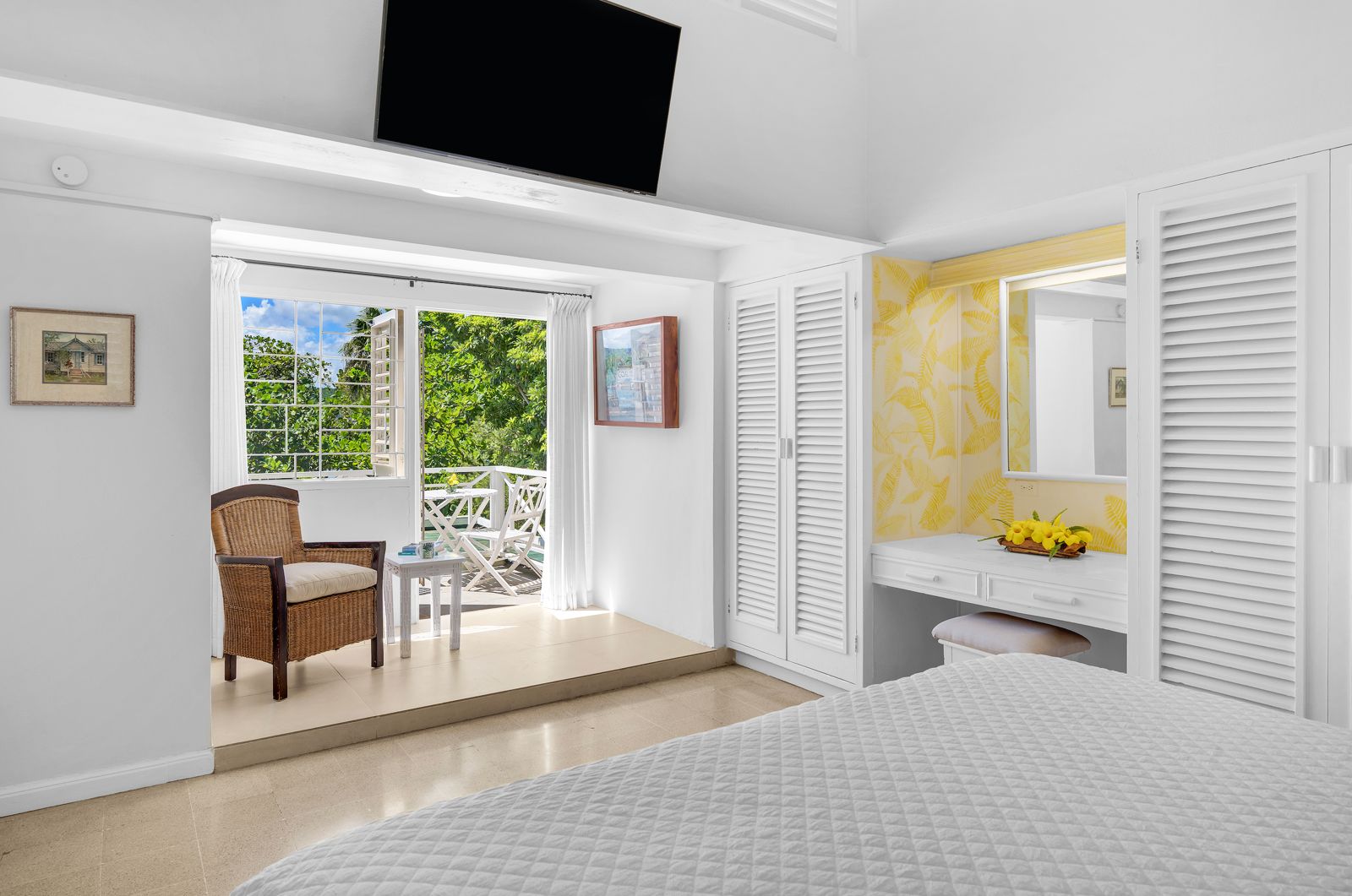 Downstairs. King-size or twin beds at guests’ option, flat-screen TV, and DVD. En-suite bath with shower. View of grounds, pool, and bay.