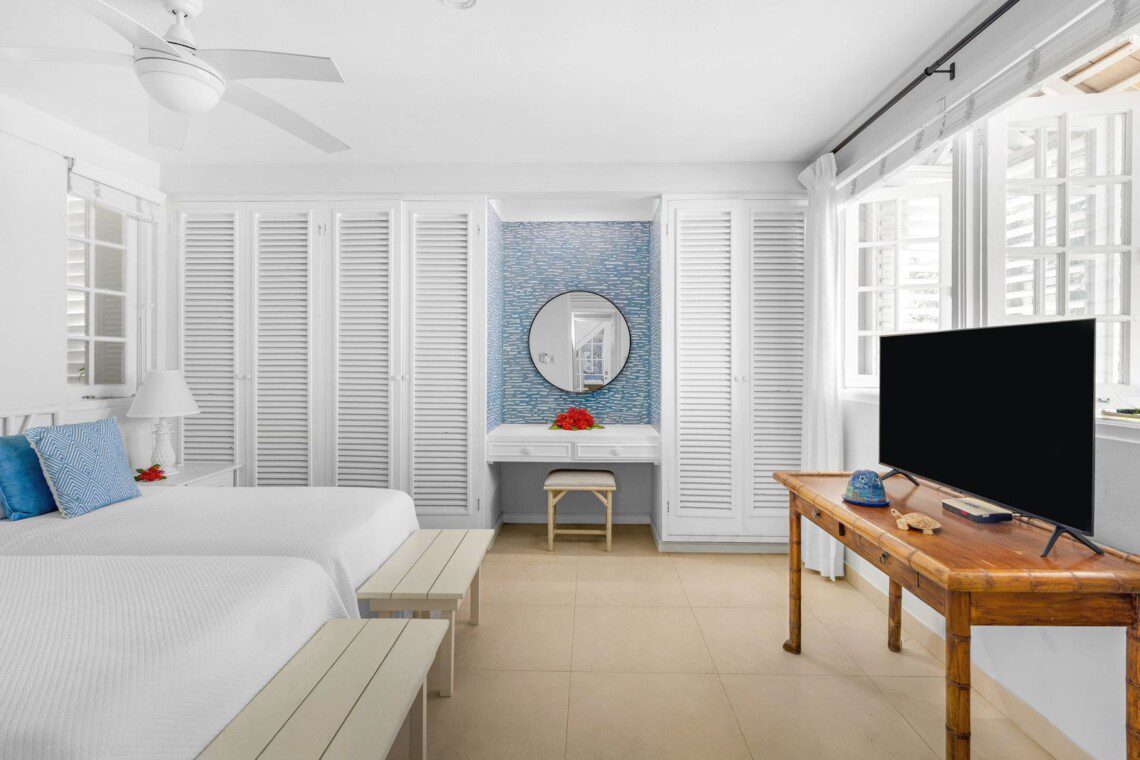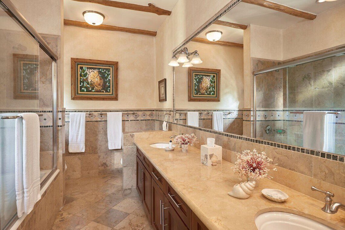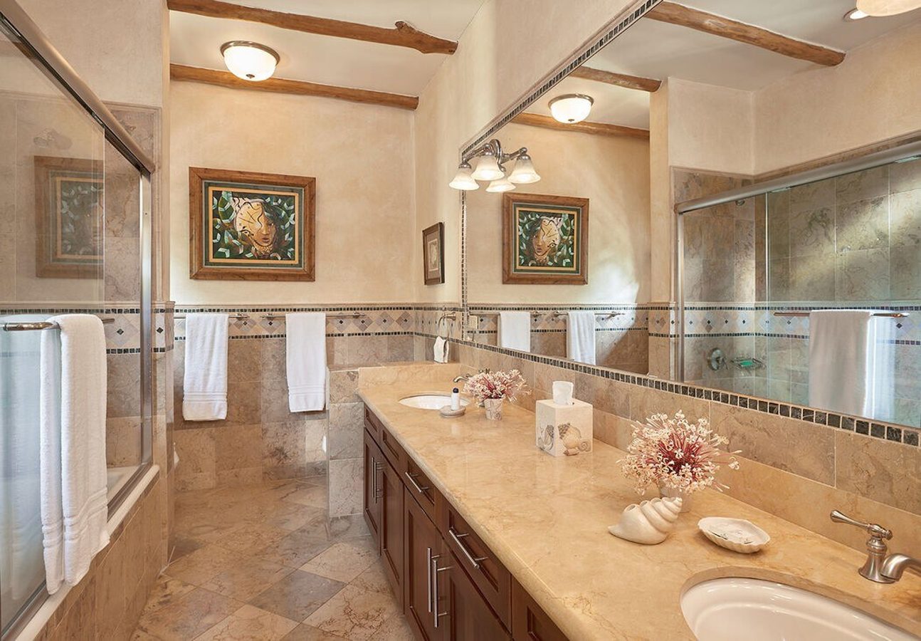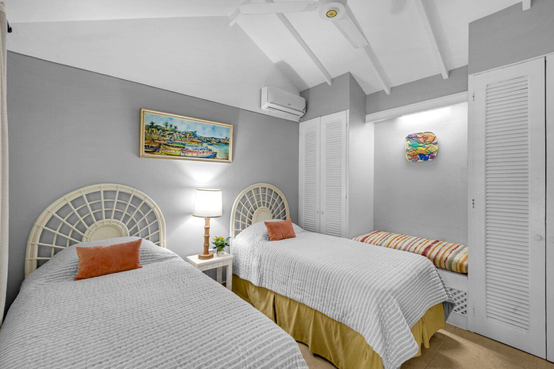 Downstairs. King-size or twin beds at guests’ option, flat-screen TV, and DVD. En-suite bath with shower. View of grounds, pool, and bay.