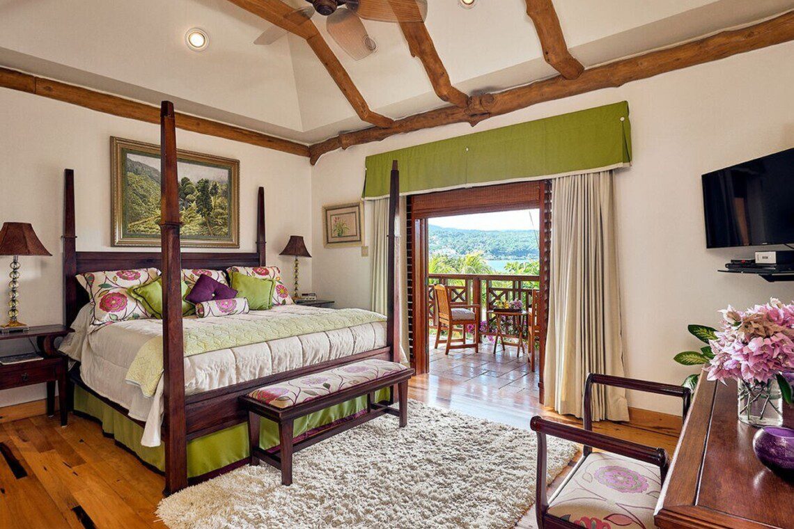 Upstairs. King-size bed; en-suite bathroom with bidet and tub-shower combination. French doors to a private balcony and a view of the grounds and bay.