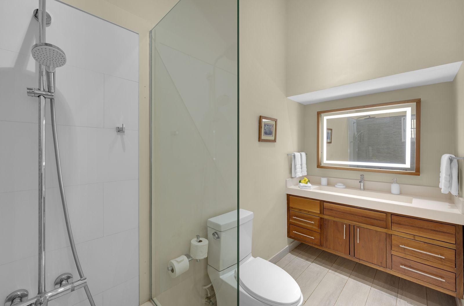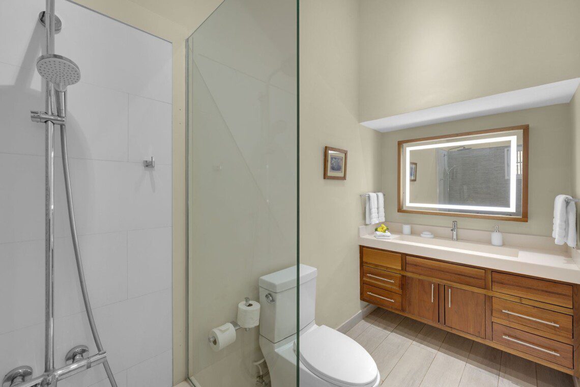 Three bedrooms, all with air-conditioning and a fan, with en-suite shower rooms