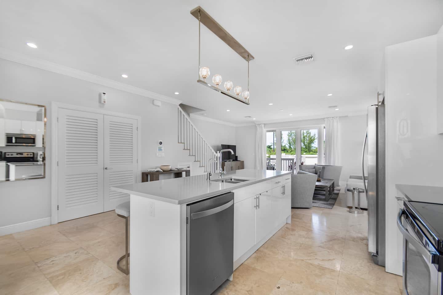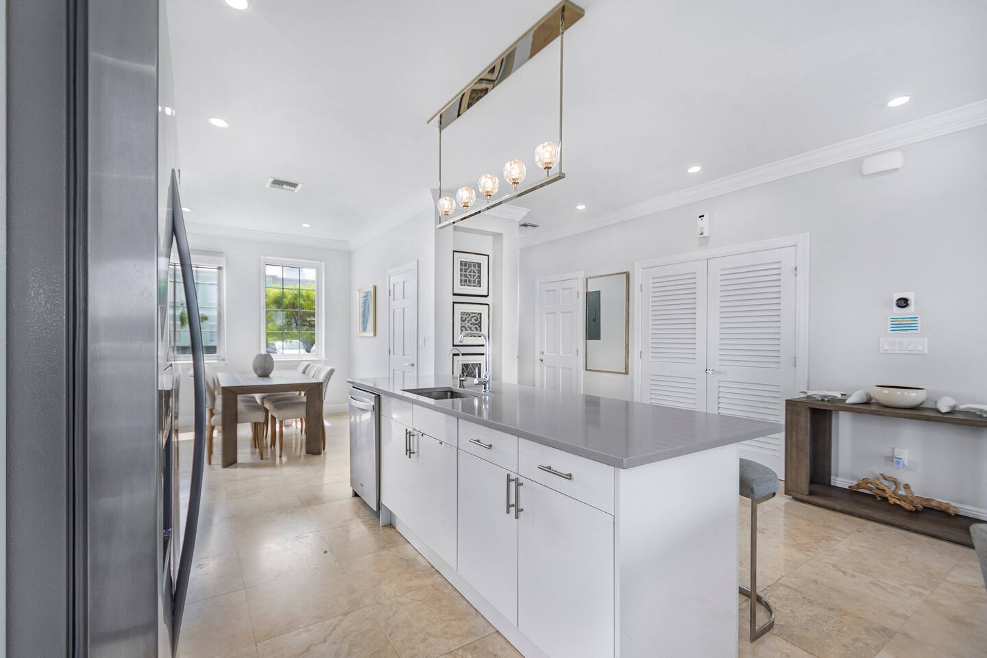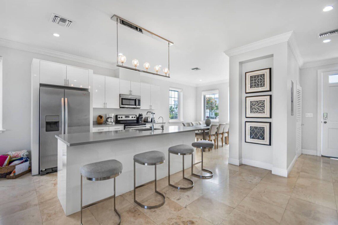 The kitchen at The Sandpiper Villa is fully equipped with a refrigerator and all essential appliances and has a fresh and bright look. There is also a laundry closet with washer and dryer.